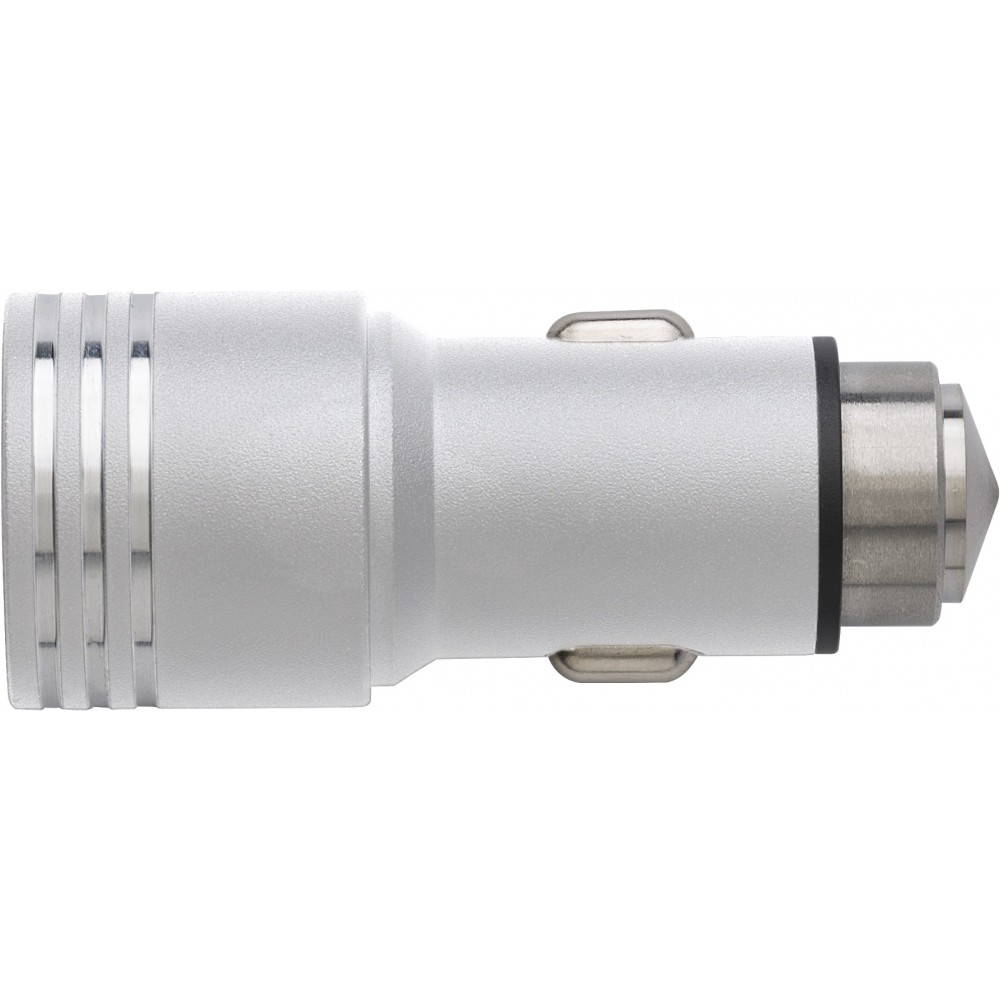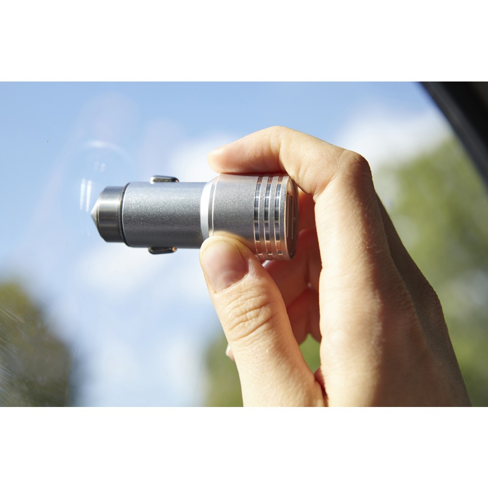 Autós adapter 2 USB kimenettel és vészhelyzeti ablalktörésre alkalmas véggel. Bemenet: DC 12-24V, kimenet: DC 5V/2.4A. Műanyag. Emblémázás: Gravírozás, Tamponnyomás