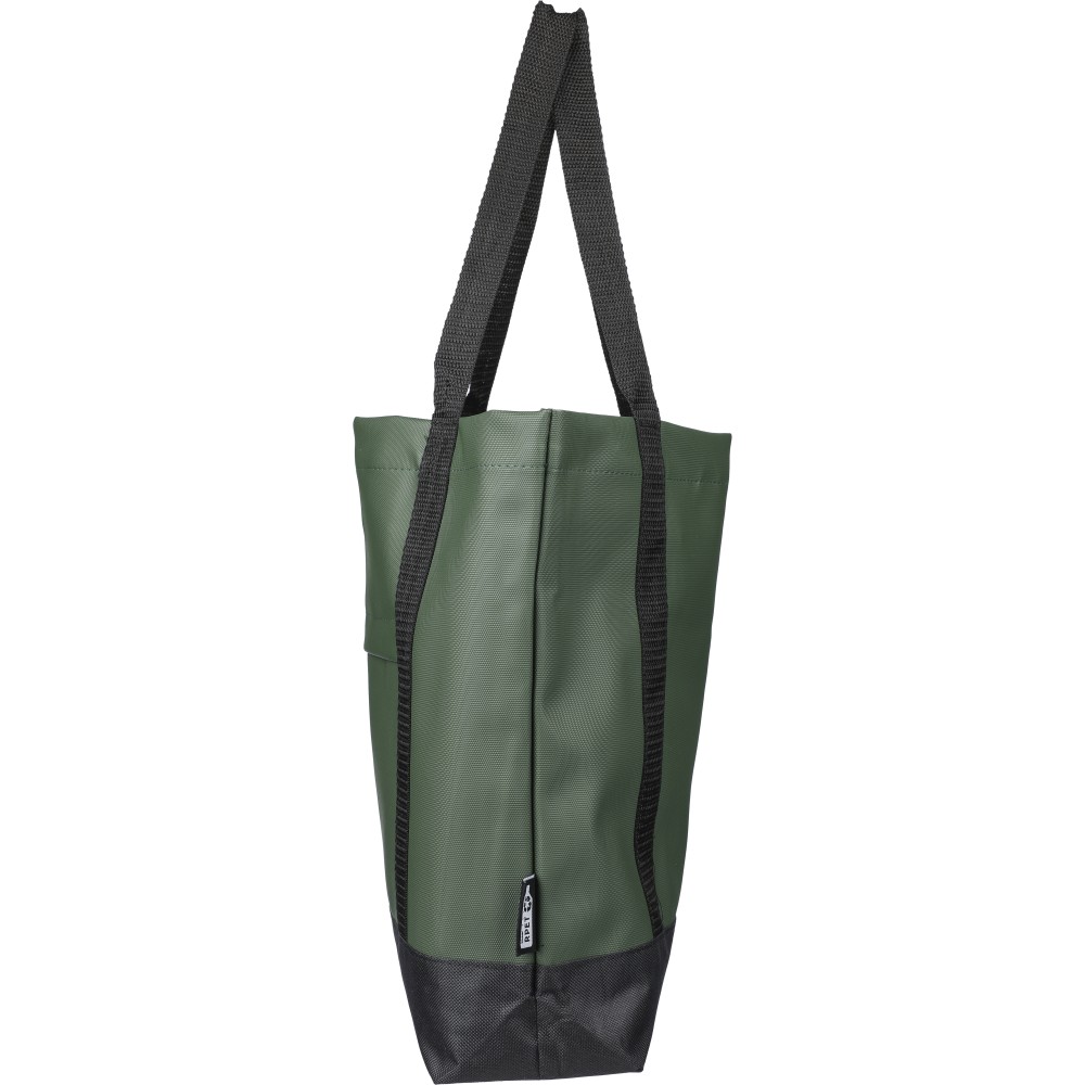 600D rPET poliészter bevásárlótáska. Mindkét oldalon PU bevonat teszi vízlepergetővé. Első cipzáras zsebbel, kicsi, belső cipzáras zsebbel és hosszú hordozófüllel. Kapacitása 10 liter. Oldalán rPET címkével. Emblémázás: Szitanyomás