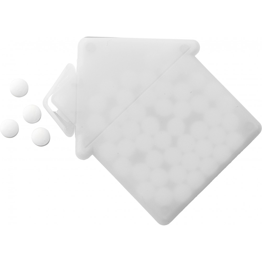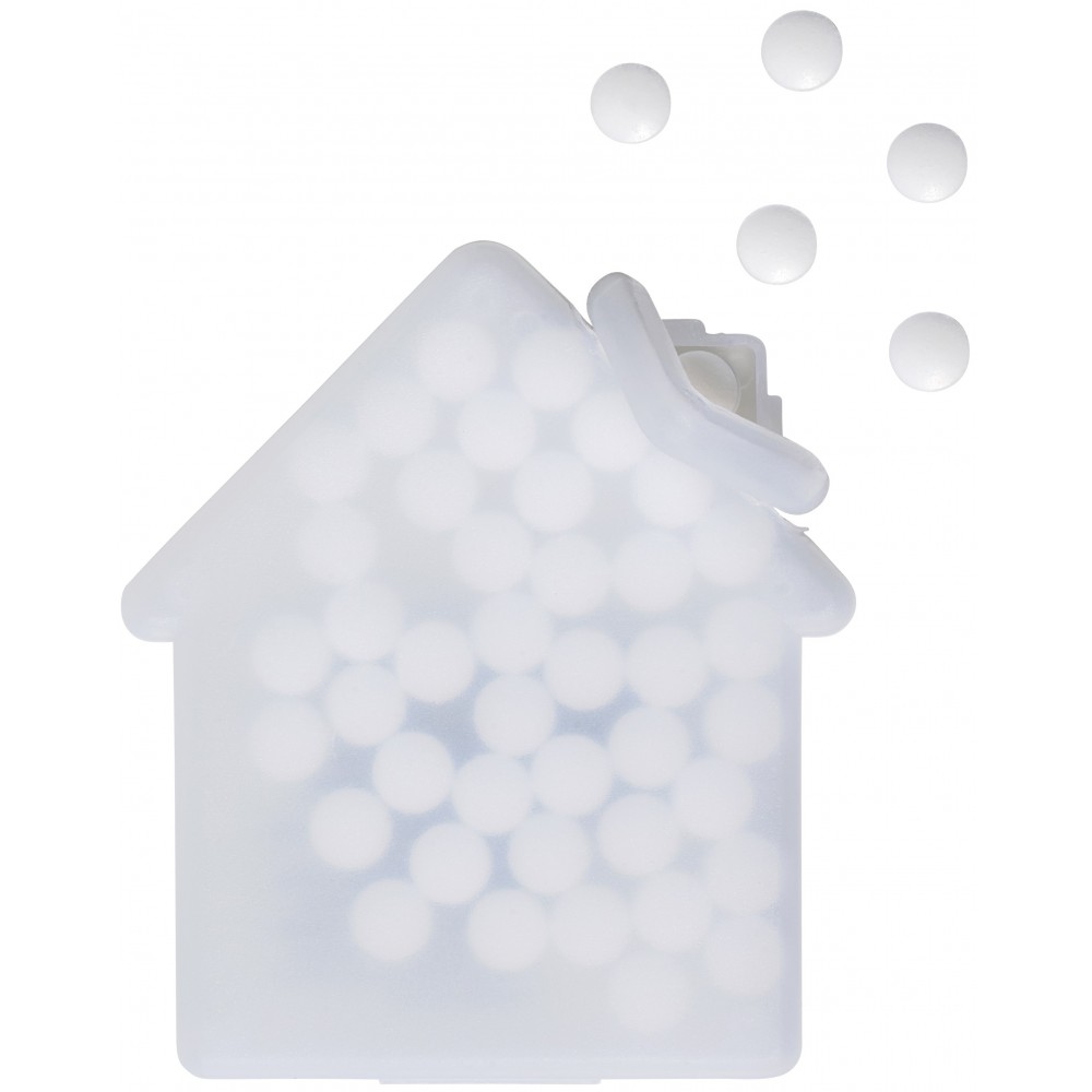 Ház alakú cukorka. 6,5 g cukormentes cukorkát tartalmaz. Emblémázás: Tamponnyomás, UV nyomtatás