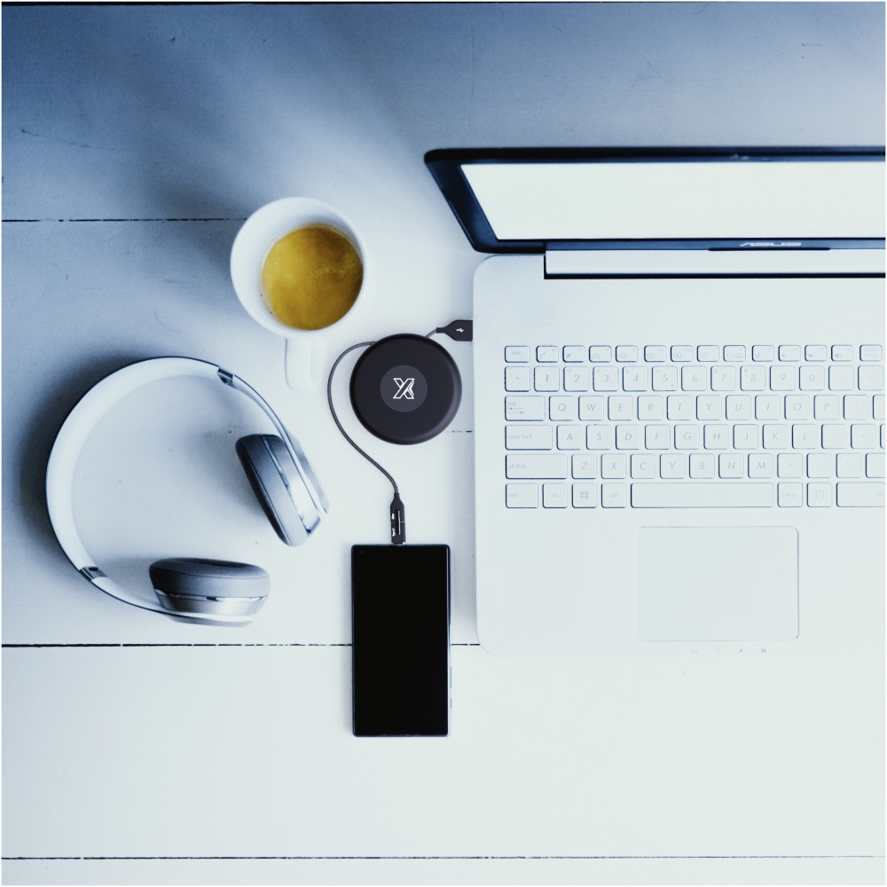 Világító logóval ellátott töltőkábel három csatlakozóval (C típusú, Android, iPhone). Szilikon tárolótasakja van, így tökéletes útközbeni kiegészítő. A csomagolás újrahasznosított papírból és újrahasznosított műanyagból készül. ABS műanyag, újrahasznosított PET műanyag. Emblémázás: Gravírozás