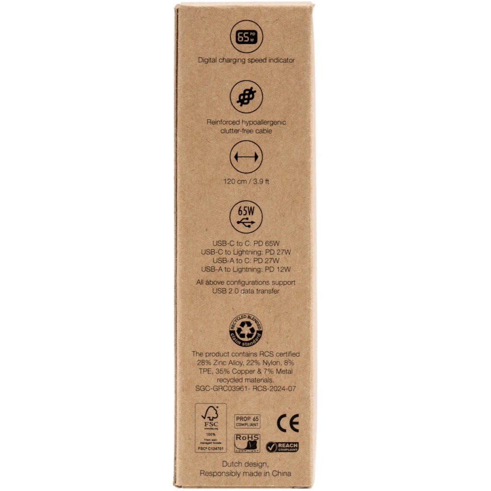 A BrandCharger Thor Eco 4 az 1-ben töltőkábel akár 65 W gyorstöltést is támogat, USB 2.0 adatátvitellel. 120 cm hosszúságú kábel újrahasznosított nejlonból, Type-C és USB-A bemenettel, valamint Type-C és Lightning kimenettel.