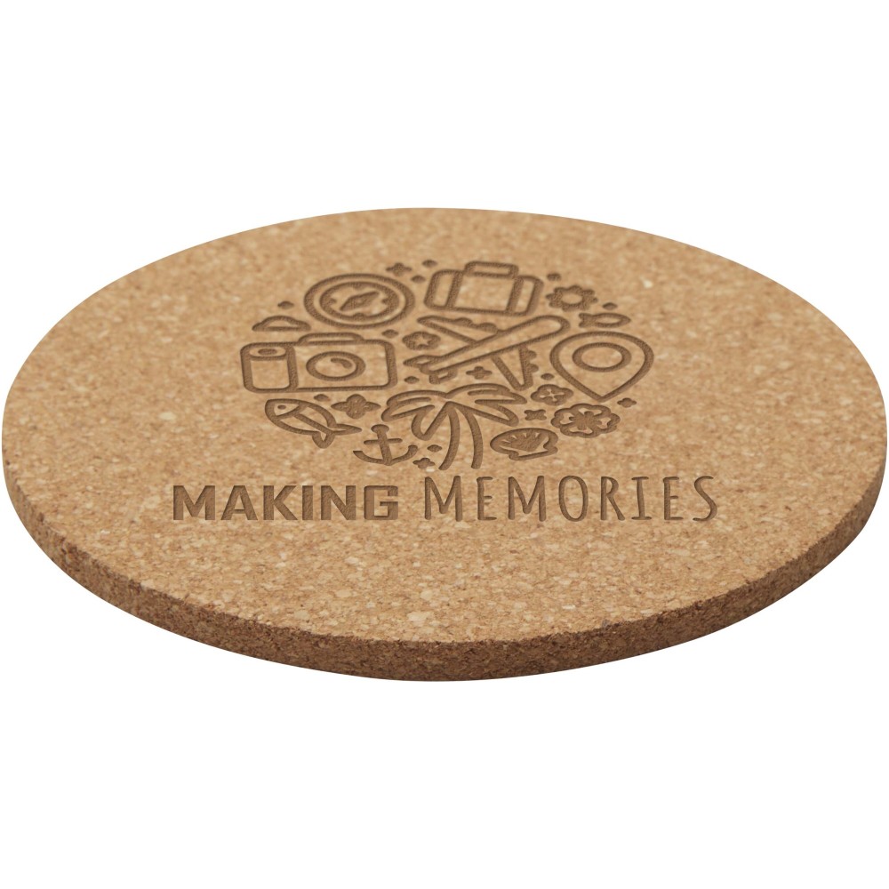 Kerek poháralátét fenntartható és társadalmilag felelős forrásból származó parafából. Mérete: 10 × 0,5 cm. Emblémázás: Gravírozás