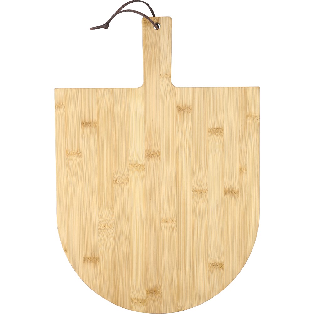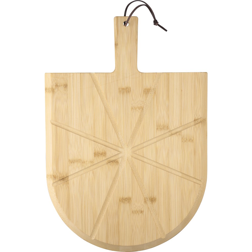 Bambusz pizzavágó deszka nyéllel és a szeletelést könnyítő barázdákkal. A készlet része egy rozsdamentes acélból és bükkfából készült pizzavágó és szervírozólapát is. A deszka nyelén PU akasztószalag található. Csomagolása barna papírdoboz. Emblémázás: Gravírozás