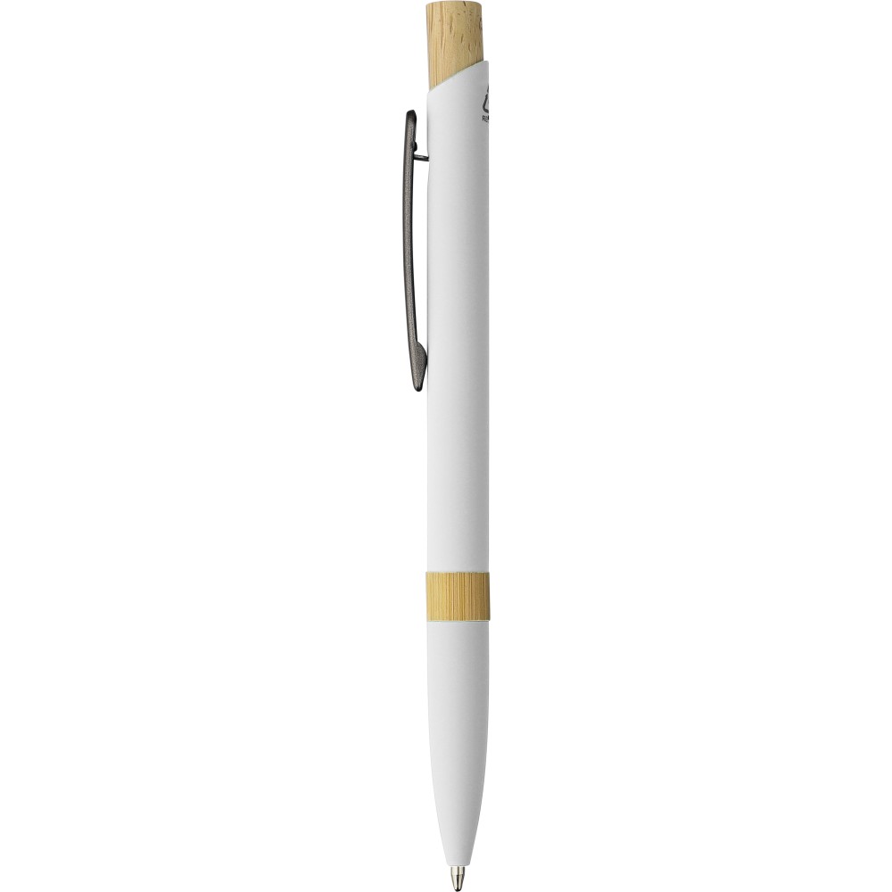 Golyóstoll újrahasznosított alumíniumból, gumírozott bevonattal, bambusz nyomógombbal és bambusz gyűrűvel a tolltesten. Kék tollbetéttel. A tollhegy vastagsága 1.0 mm, íráshossz: kb. 800 méter. Az újrahasznosított anyagra utaló logó a tollra van gravírozva. Emblémázás: Gravírozás