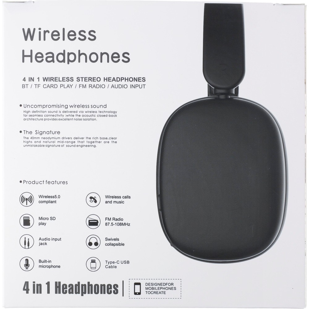 Vezeték nélküli on-ear fejhallgató 250 mAh kapacitású akkumulátorral. Type-C csatlakozás. Lejátszási idő kb. 10 óra, készenléti idő kb. 200 óra. Töltési idő: 2 óra. FM rádióval, TD kártyahely lehetőséggel és 5.3 vezeték nélküli kapcsolattechnológiával rendelkezik. Frekvenciatartomány: 20-20 000 Hz. 32 ohm, decibel érték: 105 dB š 3 dB. Vezeték nélküli hatótávolság: 10-20 méter. Darabonként csomagolva, töltőkábellel és használati útmutatóval, ajándékdobozban. ABS műanyag. Emblémázás: Tamponnyomás