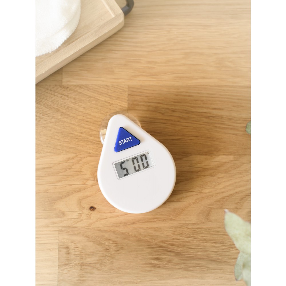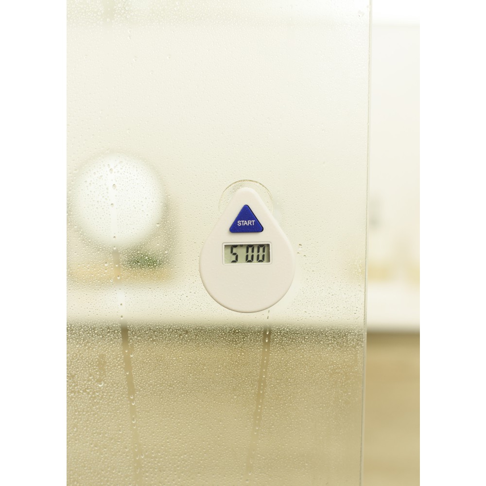 Digitális zuhanyidő-mérő tapadókoronggal és nyomógombbal az elülső oldalon. ABS műanyag. Emblémázás: Tamponnyomás