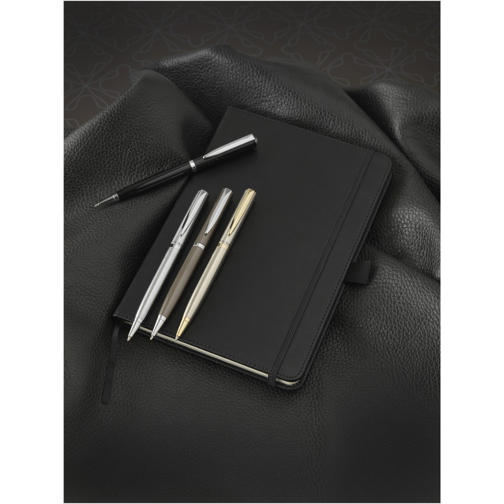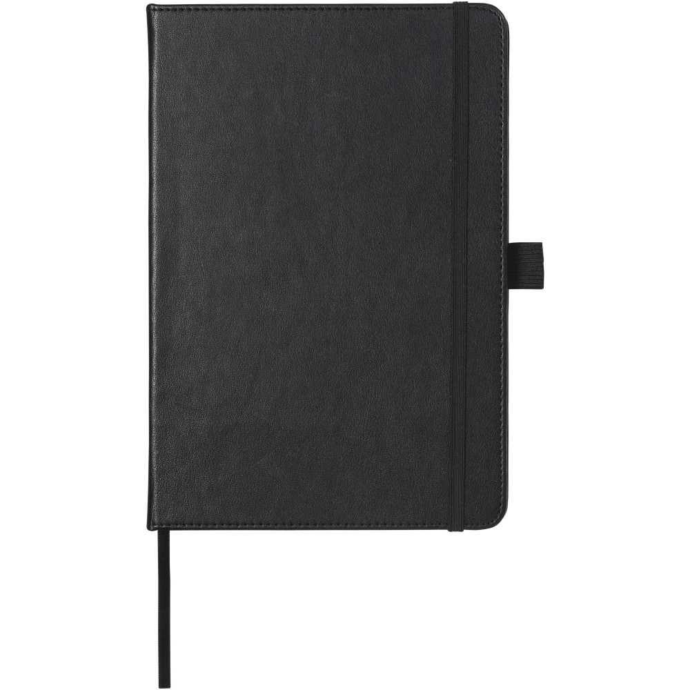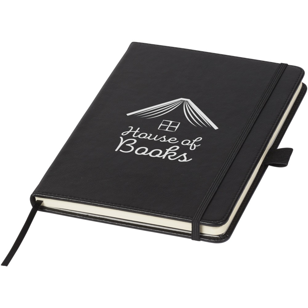 Kiválóan kialakított A5 méretű füzet, 80 db krémszínű vonalas lappal, belső merevítő lappal és tollhurokkal. Csomagolása Luxe ajándékdoboz. Műbőr. Emblémázás: Tamponnyomás, UV nyomtatás