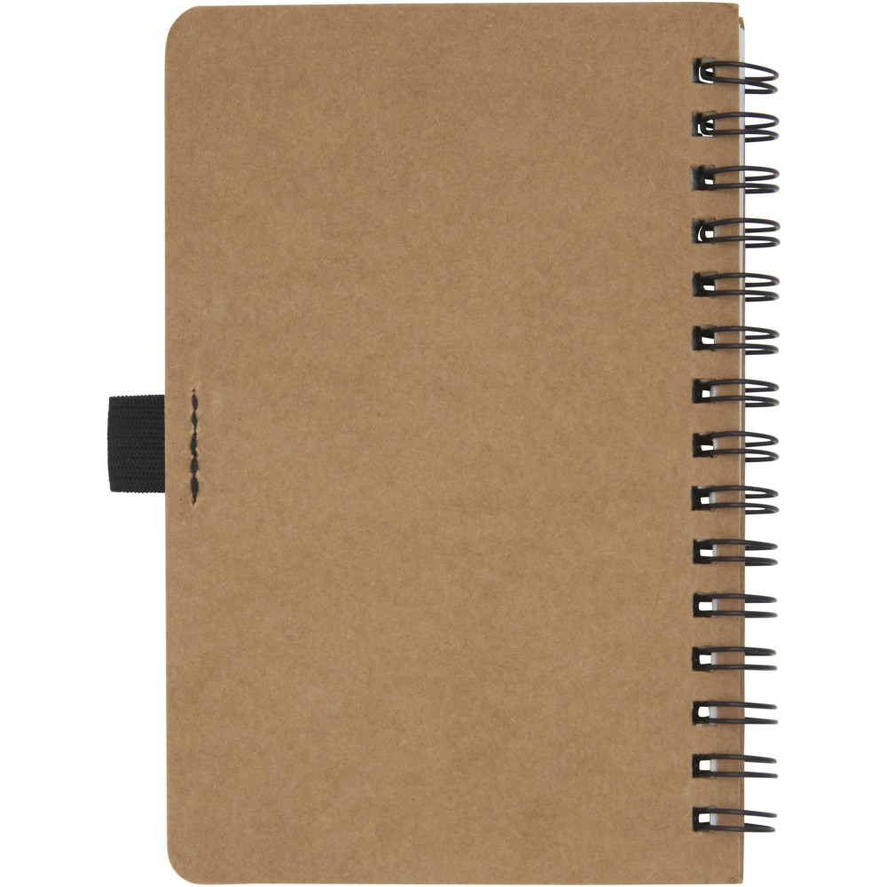 A6 méretű spirálfüzet újrahasznosított karton fedéllel, tollhurokkal. 70 db 60 g / m2 vonalas kőpapír lapok. A kőpapír 100% famentes és a gyártási eljárás során kevesebb energiát használnak fel, mint az újrahasznosított vagy új papír előállítása esetében. A papír vízálló és szakadásálló, természetes fehér színű (nem fehérített). Újrahasznosított karton, kőpapír. Emblémázás: Tamponnyomás