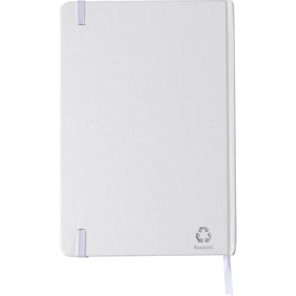 Újrahasznosított kartonból készült A5-ös jegyzetfüzet 80 vonalas lappal. Gumis záródás és könyvjelző szalag. Emblémázás: Tamponnyomás, UV nyomtatás