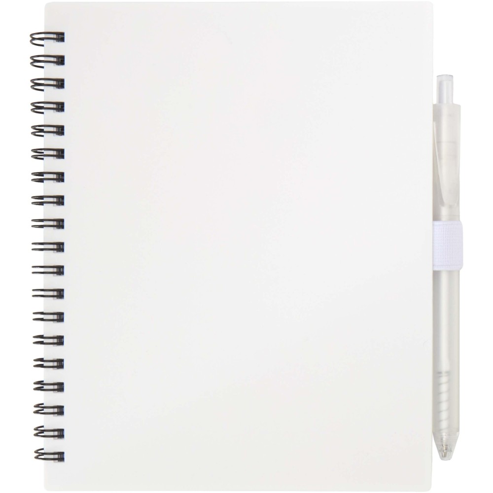 A Niove puhafedeles jegyzetfüzet újrahasznosított műanyagból készült, 70 darab, pontozott, 70 g/m2 papírlappal. A jegyzetfüzet sarkai lekerekítettek, és tolltartóhurokkal rendelkezik. Mérete: 140 × 178 mm. A golyóstoll szintén újrahasznosított műanyagból készült. Tollbetét színe: kék. Íráshossz: 1000 méter. Hegyméret: 1,0 mm. Emblémázás: Szitanyomás, Tamponnyomás