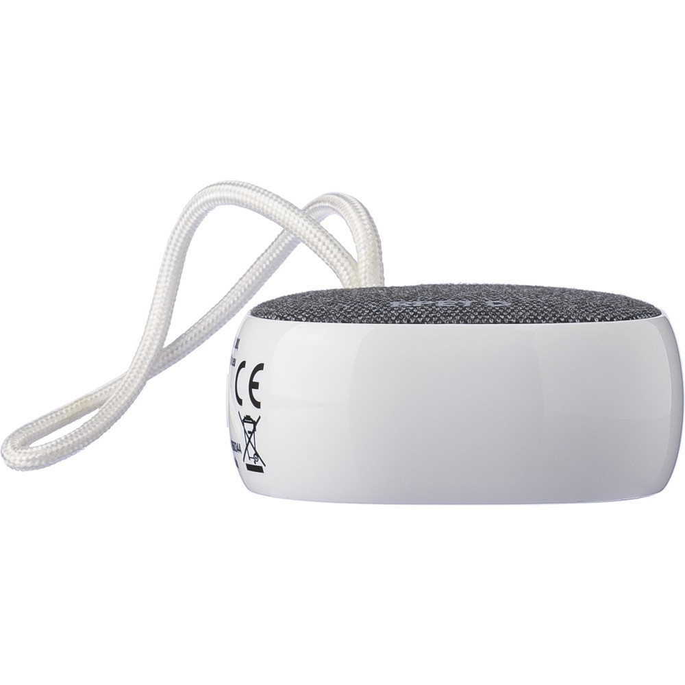 Újrahasznosított ABS és rPET anyagból készült vezeték nélküli hangszóró vékony nejlon hordozópánttal. 3 W teljesítmény, 300 mAh akkumulátor, 5.3-as vezeték nélküli technológia és 10 méteres hatótávolság. 30 cm-es fehér USB-C töltőkábellel. Az anyagon rPET logóval, az oldalán pedig újrahasznosított ABS logóval. Egyenként csomagolva, barna kartondobozban. Emblémázás: Tamponnyomás