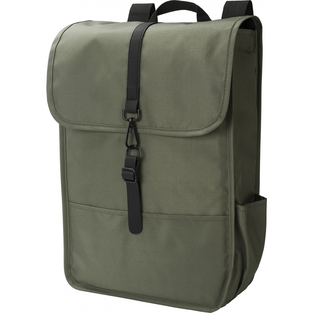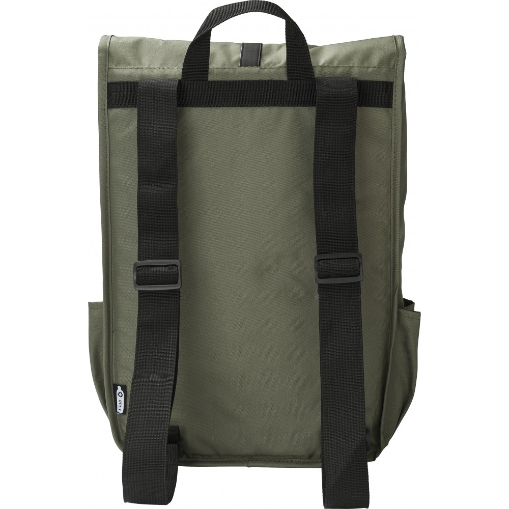 Hátizsák. Két palackzseb az oldalán, egy nagy rekesz. Fekete PU pánttal, csattal zárható. 300D RPET poliészter. Emblémázás: Szitanyomás