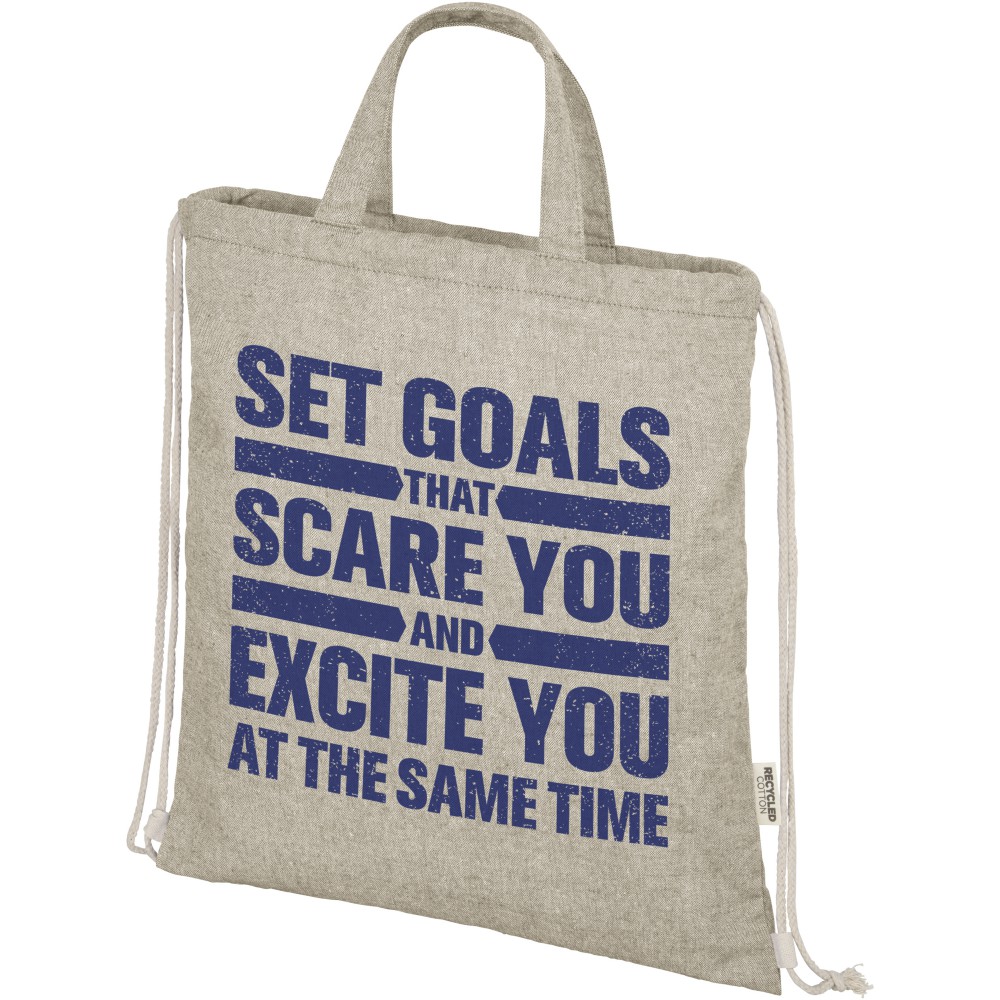 Zsinóros hátizsák 150 g/m2 súlyú újrahasznosított pamut-poliészter keverékből. Tágas, pamut zsinórral záródó, természetes színű fő rekesz. Az újrahasznosított pamutot a textilgyárakban a vágási folyamat során keletkező hulladékból állítják elő. A hasonló színeket összekeverik, így nincs szükség további festésre. Az újrahasznosított pamut természetéből adódóan nagyon enyhe színeltérések előfordulhatnak. Minden hátizsákhoz egy Aware nyomjelző is tartozik, ez az innovatív funkció lehetővé teszi a felhasználók számára, hogy egy QR-kód segítségével nyomon követhessék a termék eredetét és útját, növelve az ellátási lánc átláthatóságát és elősegíti a termék és a gyártási folyamat közötti szorosabb kapcsolatot. Teherbírás: 5 kg. Emblémázás: Szitanyomás