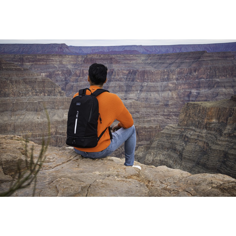 A Nomad hátizsák újrahasznosított PET-palackokból készült, és városi kalandokhoz, egynapos túrákhoz és utazásokhoz használható. Izoterm zsebe az ételeket hűvösen vagy melegen tartja. Több zsebbel is rendelkezik a rendszerezéshez, a belső tokban elfér egy ivótasak vagy egy 15,6"-es laptop. Légáteresztő, ütéselnyelő párnázott hátrésze gondoskodik a kényelemről, míg az állítható oldalzsebek vizespalackok vagy esernyők tárolására alkalmasak. Víz- és folttaszító fényvisszaverő elemekkel a közlekedésbiztonság érdekében.