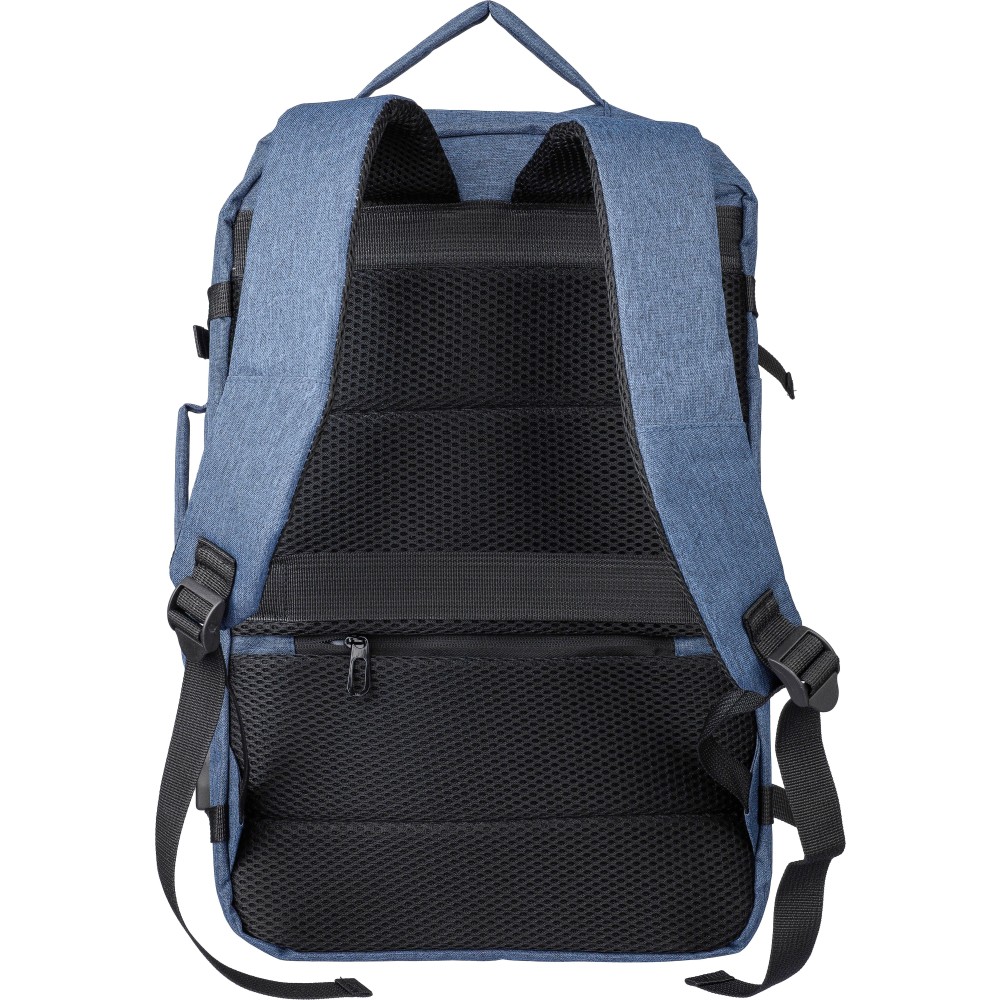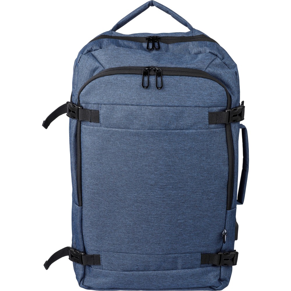 Hátizsák és laptoptáska 17"-es készülékhez. Kézipoggyász méretű. Hordozófüllel a tetején és oldalain. Tépőzáras laptop rekesszel, lopásgátló zsebbel és két nagy cipzáras rekesszel. Szellőző, párnázott hátoldallal, bőröndre húzható pánttal, zárócsatokkal és oldalsó USB-A porttal rendelkezik. Oldalsó csatok segítik a csomag kompakt tartását. Terhelhetősége kb. 12 kg. RPET alapanyagra utaló címke. Anyaga: 300D rPET poliészter. Emblémázás: Szitanyomás