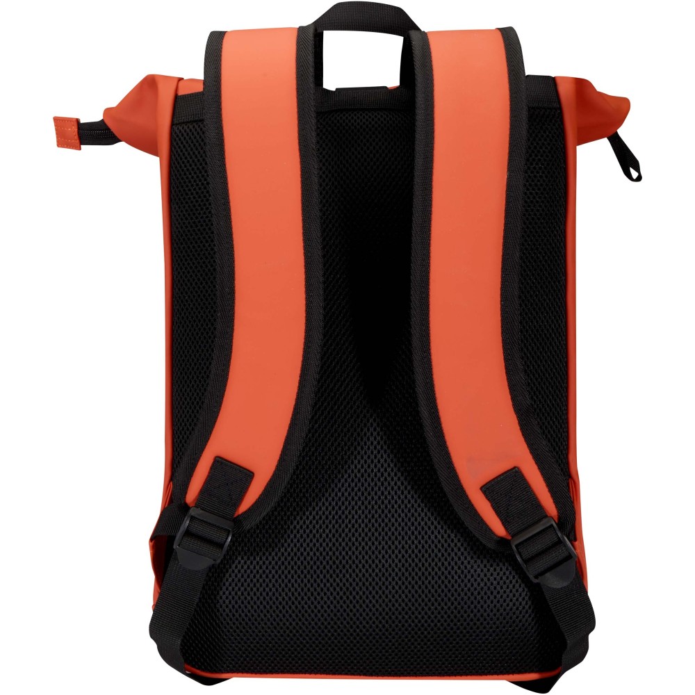 Prémium, újrahasznosított PU bőrből készült, színben harmonizáló RPET béléssel, ez a rolltop hátizsák modern megjelenést és hosszú élettartamot kínál. Vízlepergető felülete megóvja a tartalmát esőtől és nedvességtől, míg a feltekerhető zárórész rugalmas pakolást tesz lehetővé - ideális laptop hátizsákként ingázáshoz, utazáshoz vagy edzőterembe. Belsejében párnázott rekesz található, amely akár 15,6" laptopot is biztonságosan tárol, valamint egy cipzáras zseb a technikai eszközök és mindennapi kellékek rendszerezésére. A külső részen vízálló cipzárral ellátott elülső zseb biztosít gyors és biztonságos hozzáférést, míg a párnázott, állítható vállpántok és a légáteresztő hátpanel egész napos kényelmet nyújtanak. Emblémázás: Szitanyomás