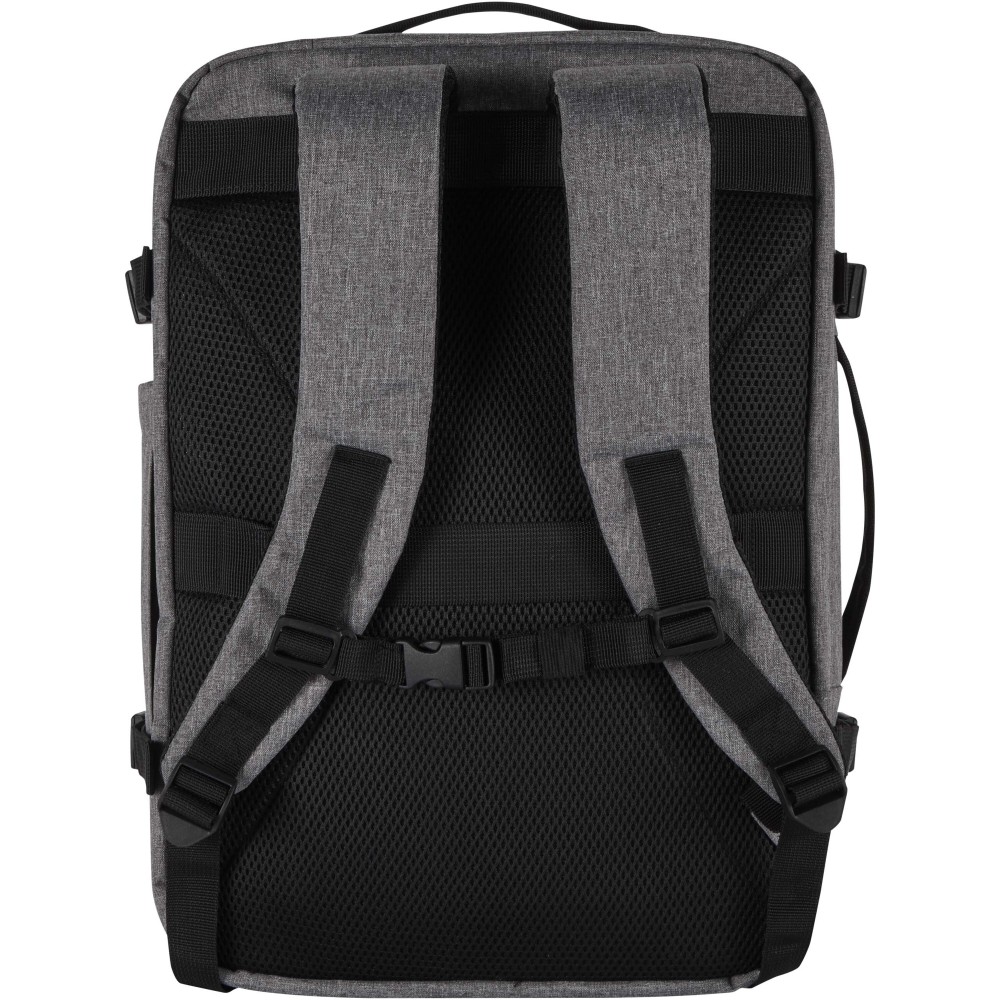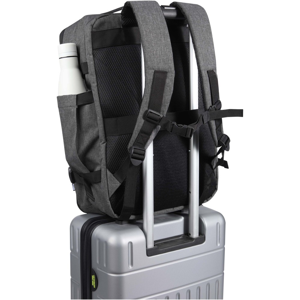 GRS tanúsítvánnyal rendelkező újrahasznosított poliészterből készült, RPET béléssel ellátott Libra hátizsák, melynek méretei megfelelnek a légitársaságok kézipoggyászra vonatkozó előírásainak. A táska egy dedikált, legfeljebb 17" méretű eszközök fogadására alkalmas laptoptartó rekesszel, valamint egy tágas főrésszel rendelkezik, amelyben rugalmas pántok és hálós elválasztók biztosítják a tartalom rendezettségét. Az elülső oldalon két nagyméretű cipzáras zseb található az alapvető kellékek gyors eléréséhez. A kényelmes viseletről és a praktikus szállításról légáteresztő hátpanel, bőröndre rögzíthető pánt, állítható vállpántok, mellkaspánt, valamint felső és oldalsó hordozófogantyúk gondoskodnak. Letisztult megjelenése és funkcionális kialakítása miatt kiváló választás üzleti utakhoz vagy irodán kívüli munkavégzéshez, miközben alapanyaga az öko-tudatosságot tükrözi.