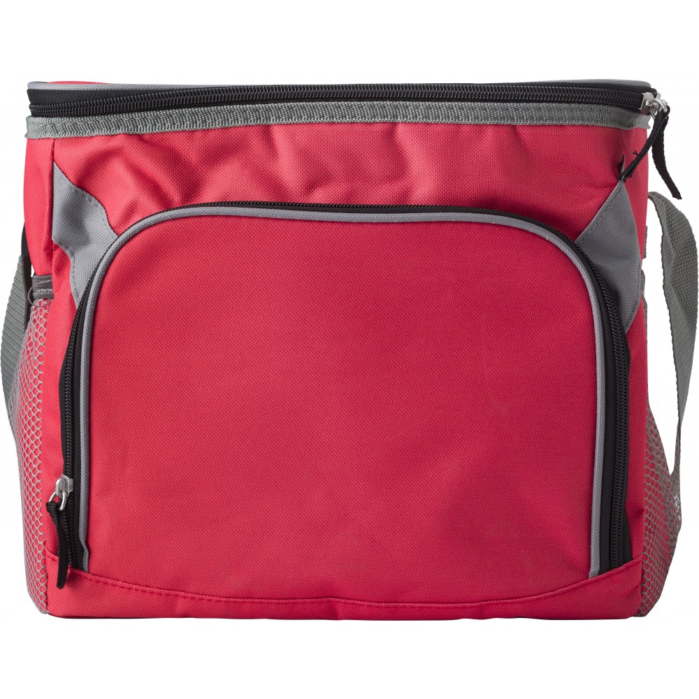 Hűtőtáska nagy cipzáros elsőzsebbel és mindkét végén hálós zsebekkel. 600D poliészter. Emblémázás: Szitanyomás