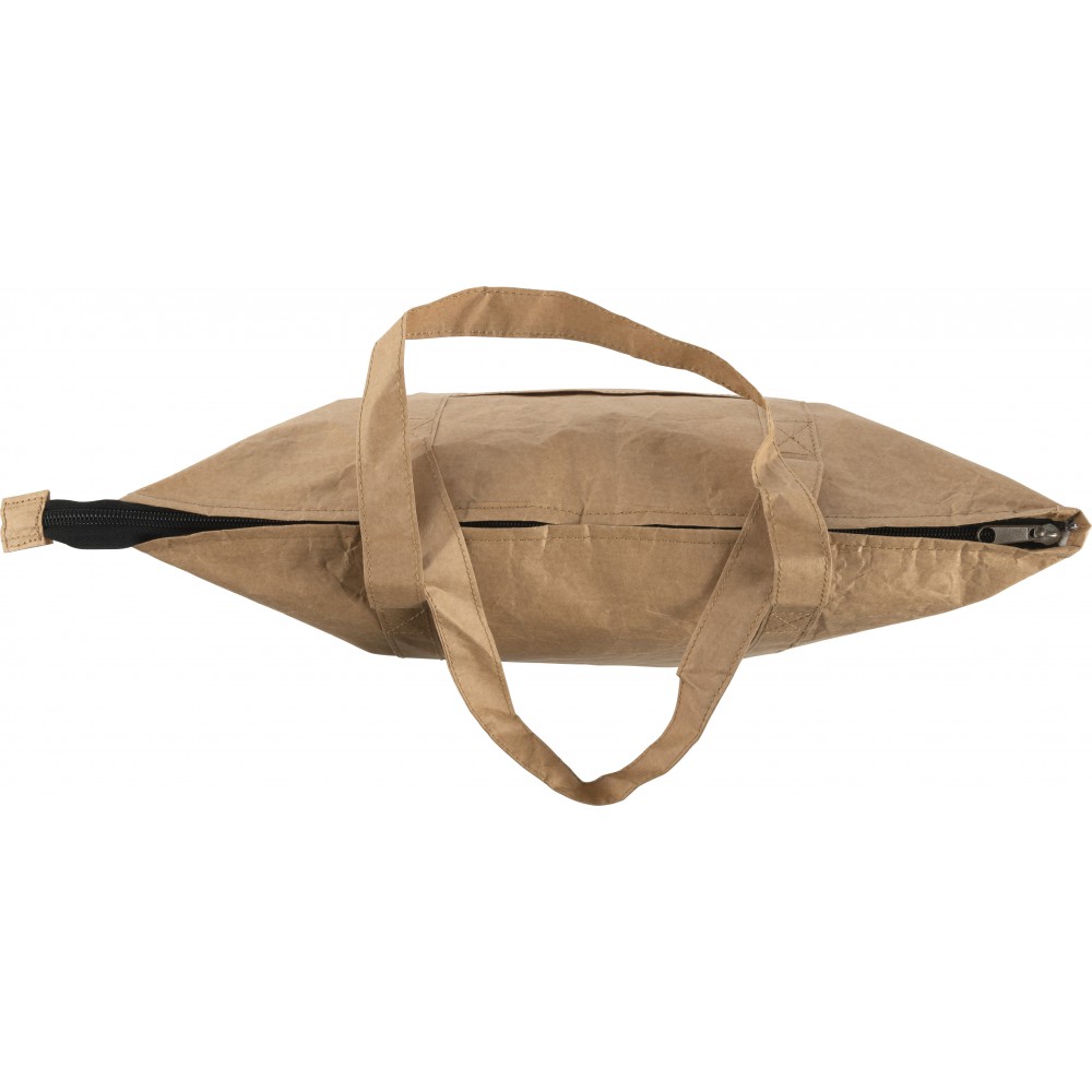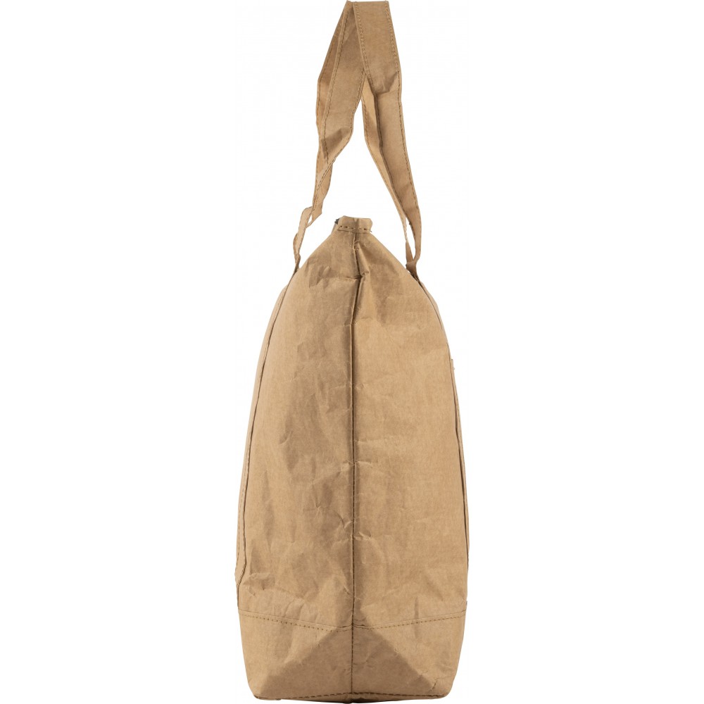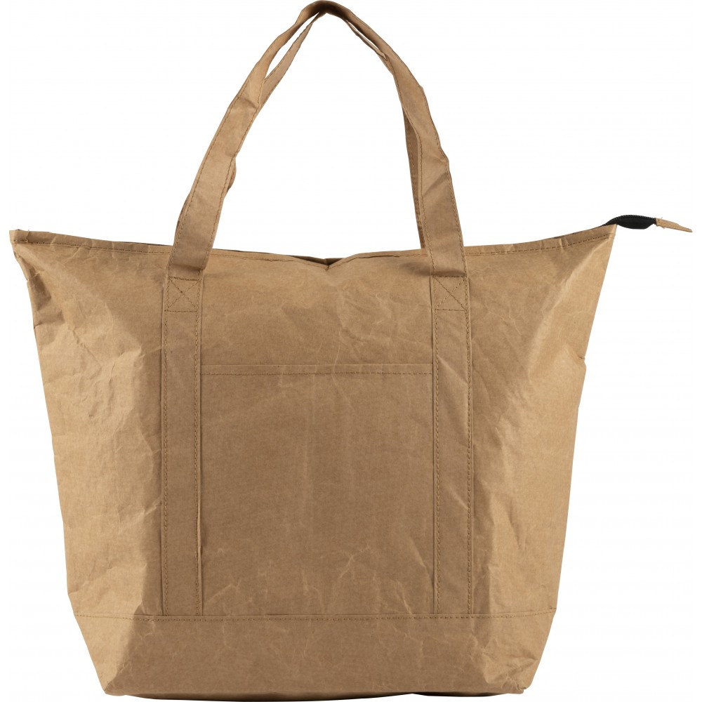Laminált papír hűtőtáska és bevásárlótáska ezüst színű fóliabéléssel. Cipzáros fő rész oldalzsebbel. A zseb mérete: 16, 8 x 15, 6 cm. PE, alumínium fólia, 80 g papír. Emblémázás: Szitanyomás