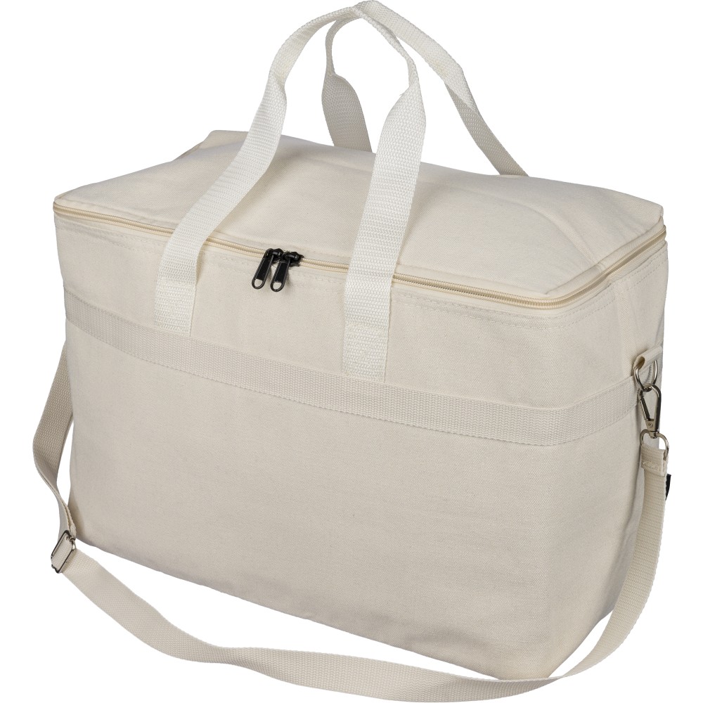 Újrahasznosított pamut-poliészter 330 g/m2 kevertszövetből készült hűtőtáska alumíniumfóliás szigeteléssel, 23 literes űrtartalommal. 60 cm hosszúságú és 3,5 cm szélességű fülekkel, 110 cm hosszúságú és 2,5 cm szélességű állítható vállpánttal, fémcsattal és a táska színével megegyező hevederrel rendelkezik. Külső felületén rPET címkével, belső részében további címkével ellátva.