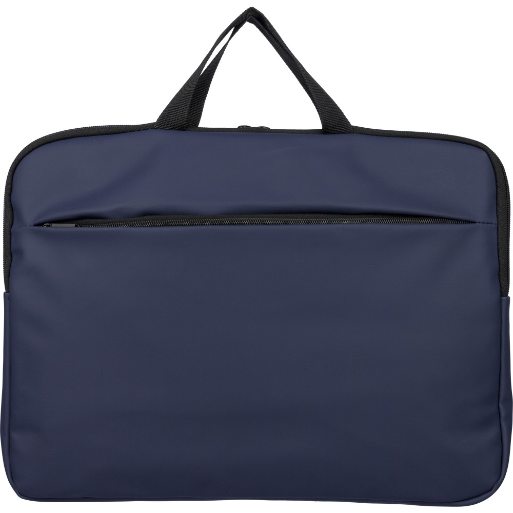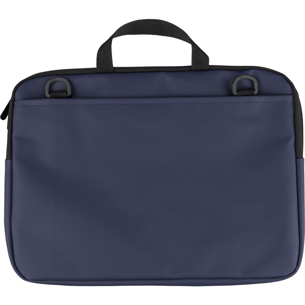 Újrahasznosított PU anyagból készült laptoptáska legfeljebb 15 hüvelykes készülékekhez, 4 mm vastag párnázással és 210D újrahasznosított béléssel. Elülső cipzáras zsebbel, hátoldali tépőzáras zsebbel, két rövid fogantyúval és állítható vállpánttal rendelkezik. A belső címkén újrahasznosított alapanyagra utaló logó található.
