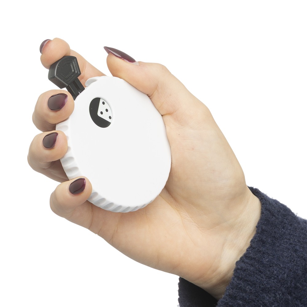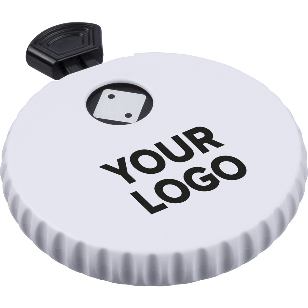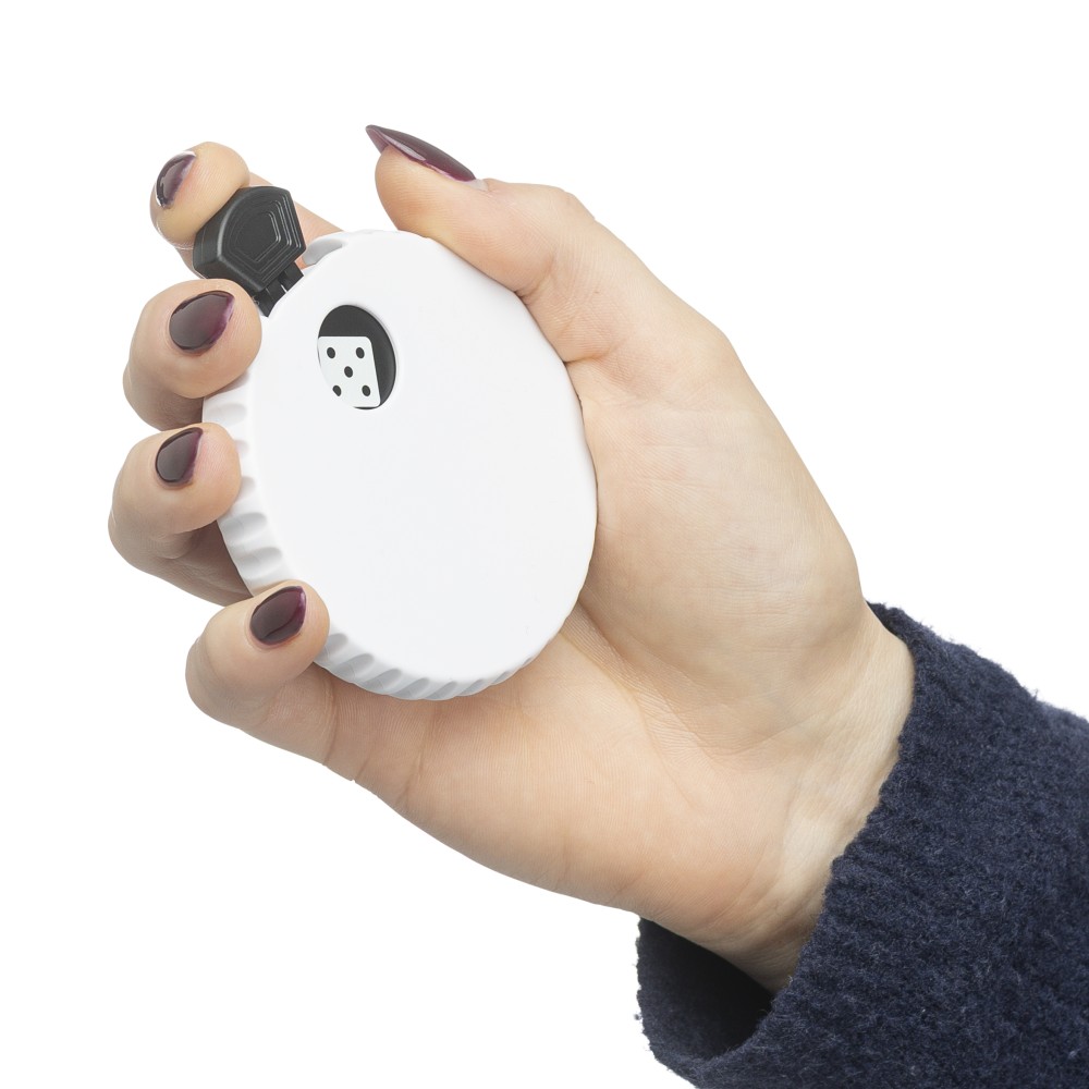 Újrahasznosított ABS-ből készült mechanikus dobókocka felső nyomógombbal. A gomb megnyomásával a mechanika véletlenszerűen jelenít meg egy 1?6 közötti számot. A hátoldalon sörnyitó található. A terméken Recycled ABS (újrahasznosított alapanyagra utaló) logó található. Újrahasznosított politasakba csomagolva.