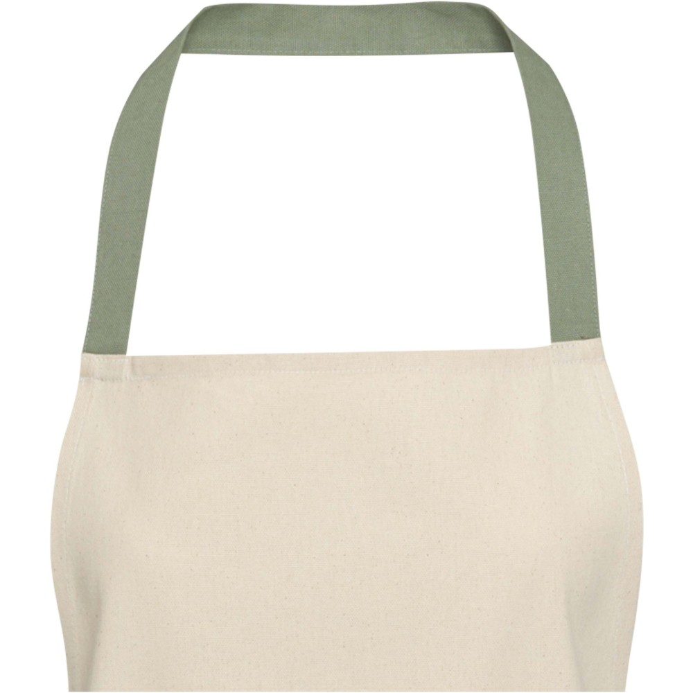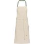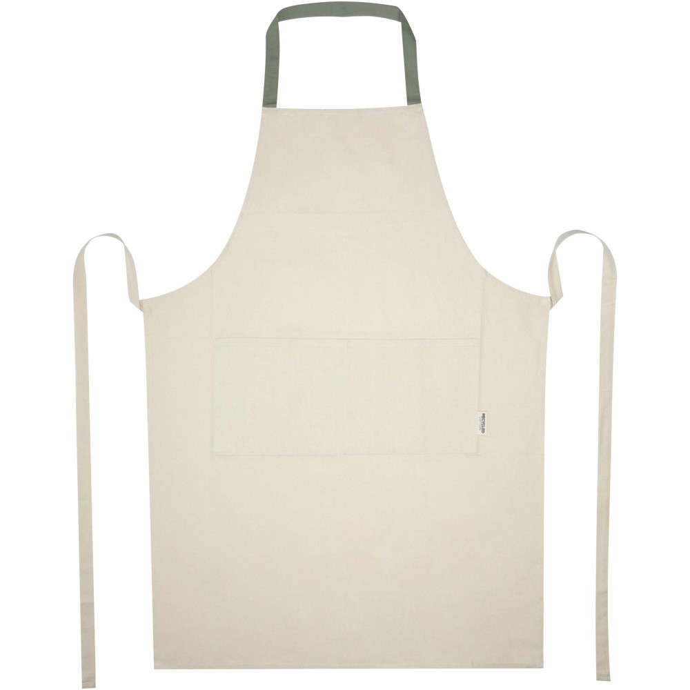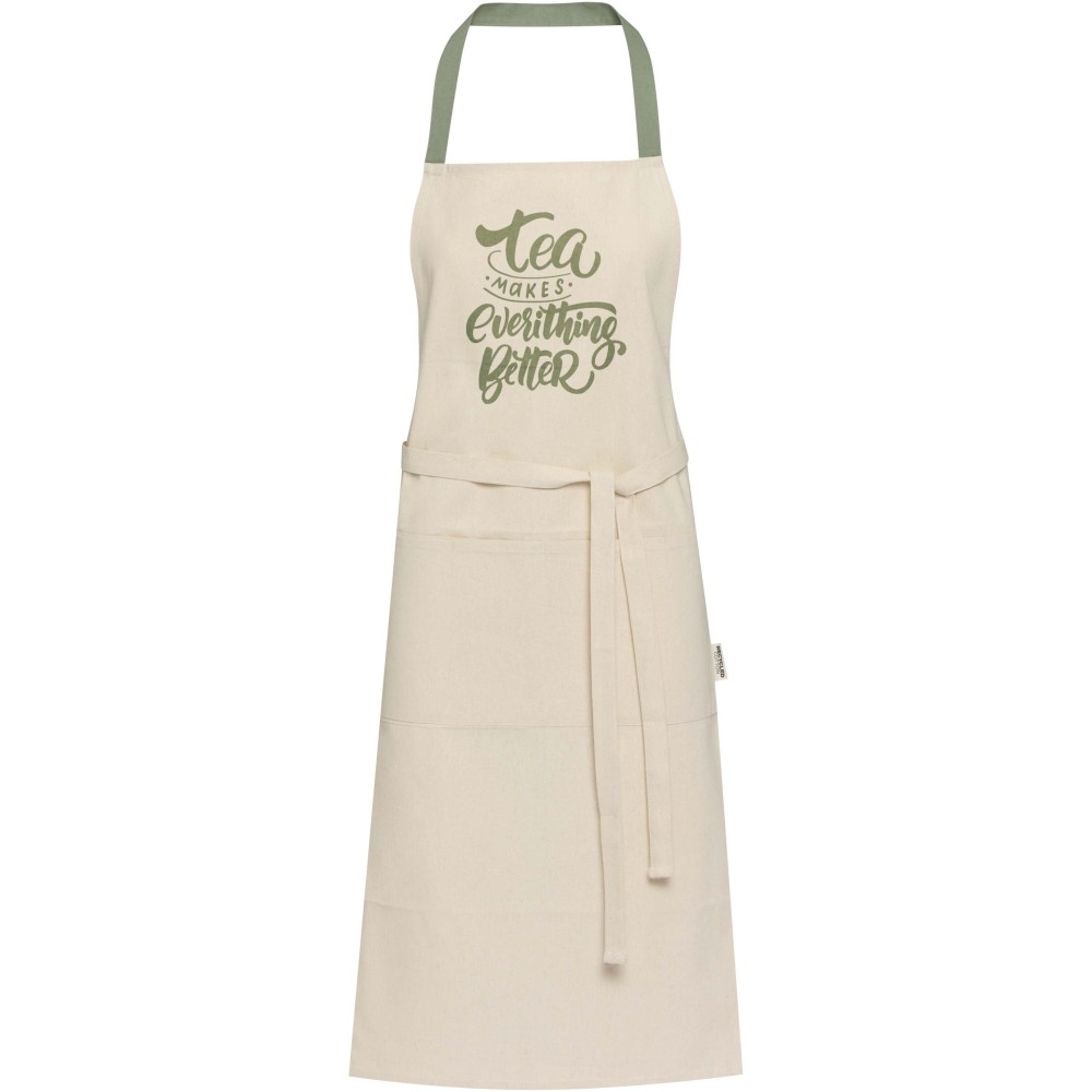 A Nia kötény 100% GRS tanúsítvánnyal rendelkező, 200 g/m2 újrahasznosított pamutból készült. Természetes pamut színe és kontrasztos nyakkpántja elegánsan védi ruhádat főzés közben. Két egymás melletti zsebbel rendelkezik, összesen 45 x 20 cm-es mérettel, és 1 méter hosszú pánttal rögzíthető hátul. Emblémázás: Hímzés, Szitanyomás