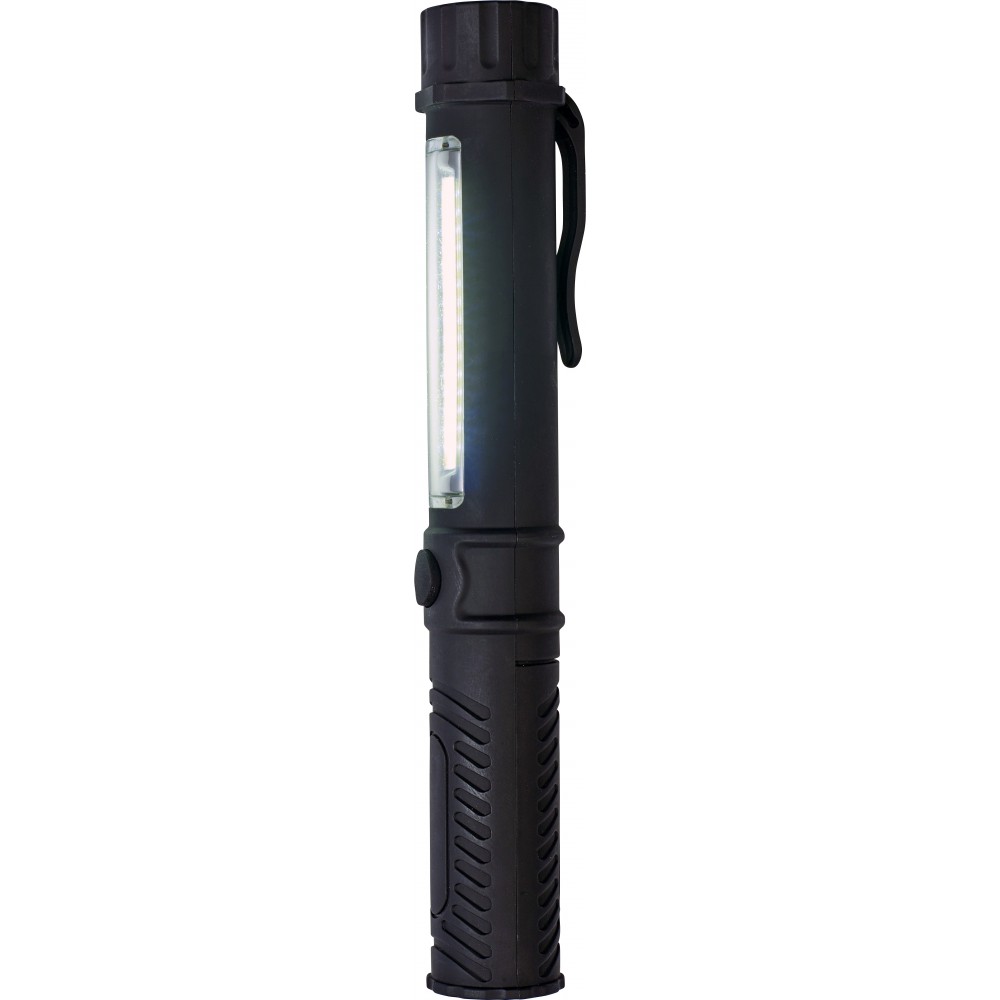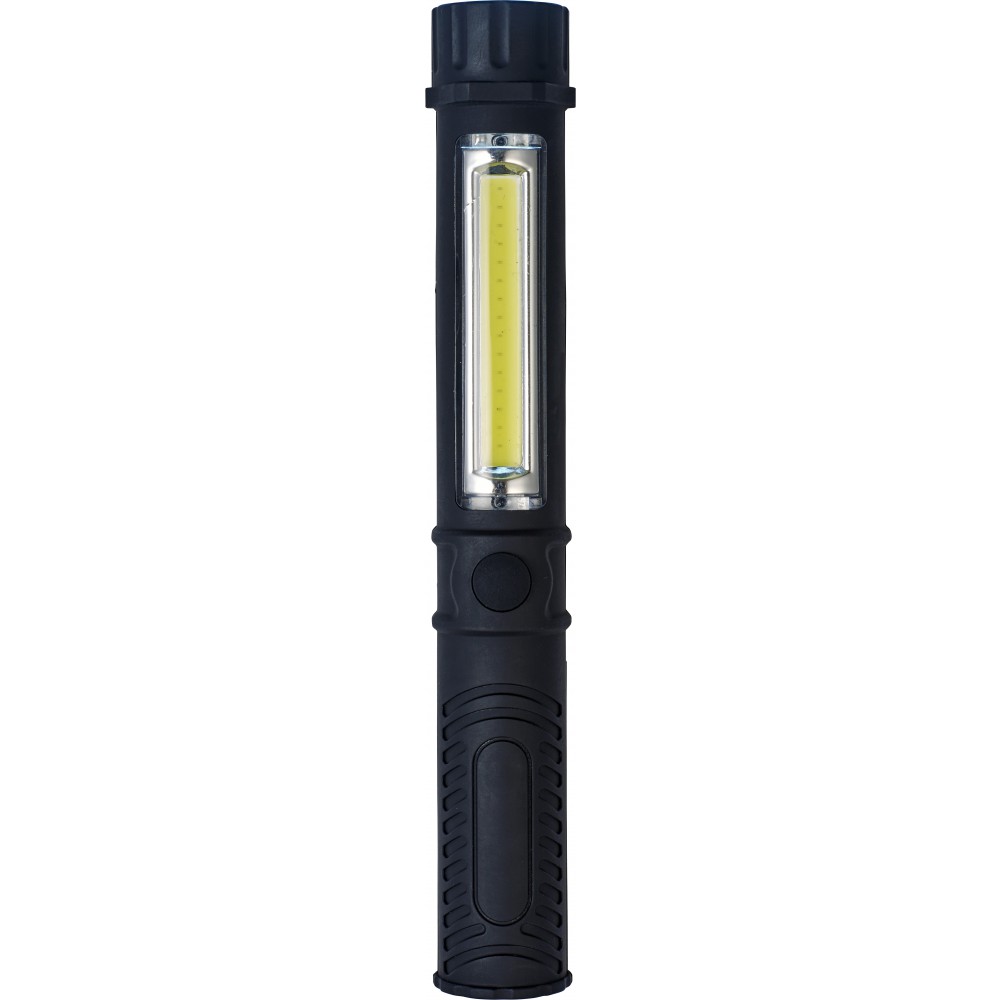 Lámpa COB (chip on board) fényforrással a tetején és az oldalán. Az elemet tartalmazza. Műanyag. Emblémázás: Tamponnyomás