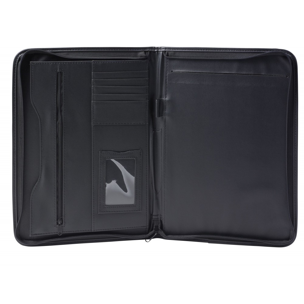A4-es cipzáras PU mappa. Jegyzettömböt és tollat nem tartalmaz. Emblémázás: Szitanyomás, Tamponnyomás