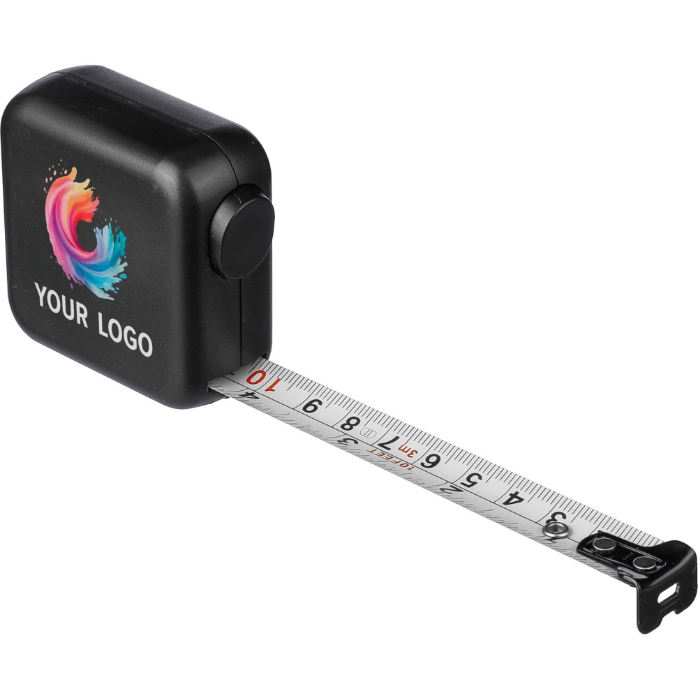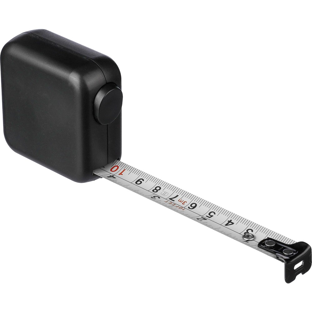 Mérőszalag. 3 méteres, 16 mm széles fém szalaggal, amelyen centiméter- és inch-beosztás is található. MID tanúsítvánnyal rendelkezik. Ultrahangos technológiával összeszerelt (csavarmentes). Nyomógombbal és zárral. Egyenként barna kartondobozba csomagolva. Anyaga: ABS. Emblémázás: Tamponnyomás