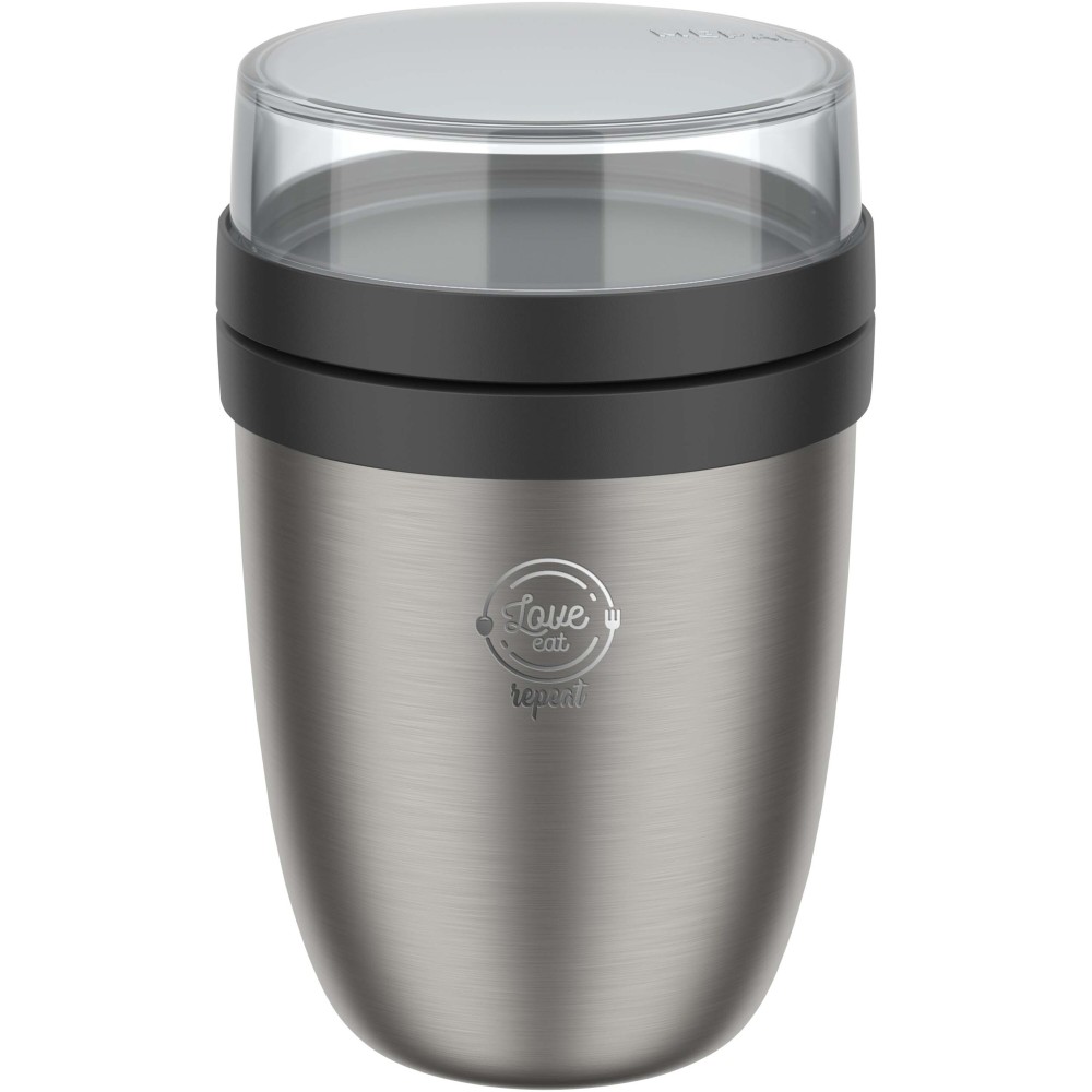 Két különálló rekesszel ellátott, hőszigetelt ételdoboz, amelyben a különböző összetevők elkülöníthetők egymástól. Mindkét tartály külön fedéllel rendelkezik, így az összetevők nem keverednek össze. Az ételt 6-8 órán át melegen, 12 órán át hidegen tartja. A felső átlátszó tartály űrtartalma 200 ml. Az alsó tartály űrtartalma 500 ml. Tartós anyagból készült, a doboz külseje hűvös és száraz marad. Kézzel való mosogatást javasolunk. A fedél műanyag részei mosogatógépben moshatók. Emblémázás: Gravírozás, Tamponnyomás