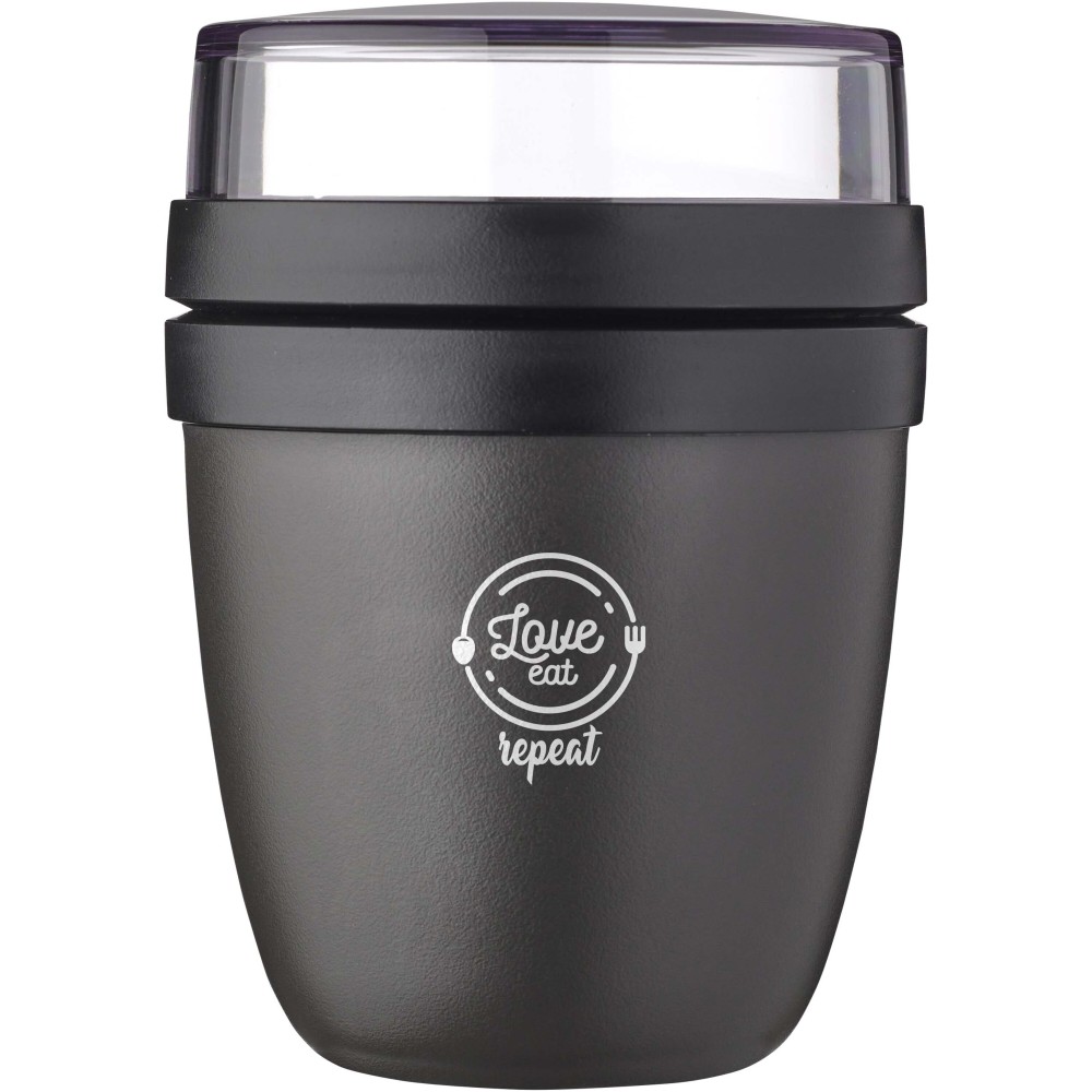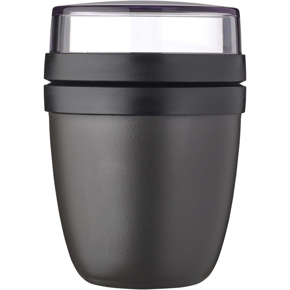 Az Ellipse Mini ételdoboz tökéletes különféle snackekhez, például joghurthoz müzlivel vagy leveshez krutonnal. Két praktikus rekesszel rendelkezik egy strapabíró tartályban, így az összetevőket szépen elkülönítheti egymástól. Kompakt mérete miatt ideális iskolatáskába való elhelyezésre, így gyors és kényelmes étkezést biztosít. A felső átlátszó tartály 120 ml-es, ideális körülbelül 50 gramm müzli vagy gyümölcs tárolására, az alsó tartály pedig 300 ml-es. Szivárgásmentes és mosogatógépben mosható. BPA-mentes. Emblémázás: Tamponnyomás