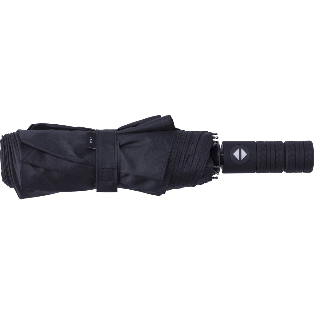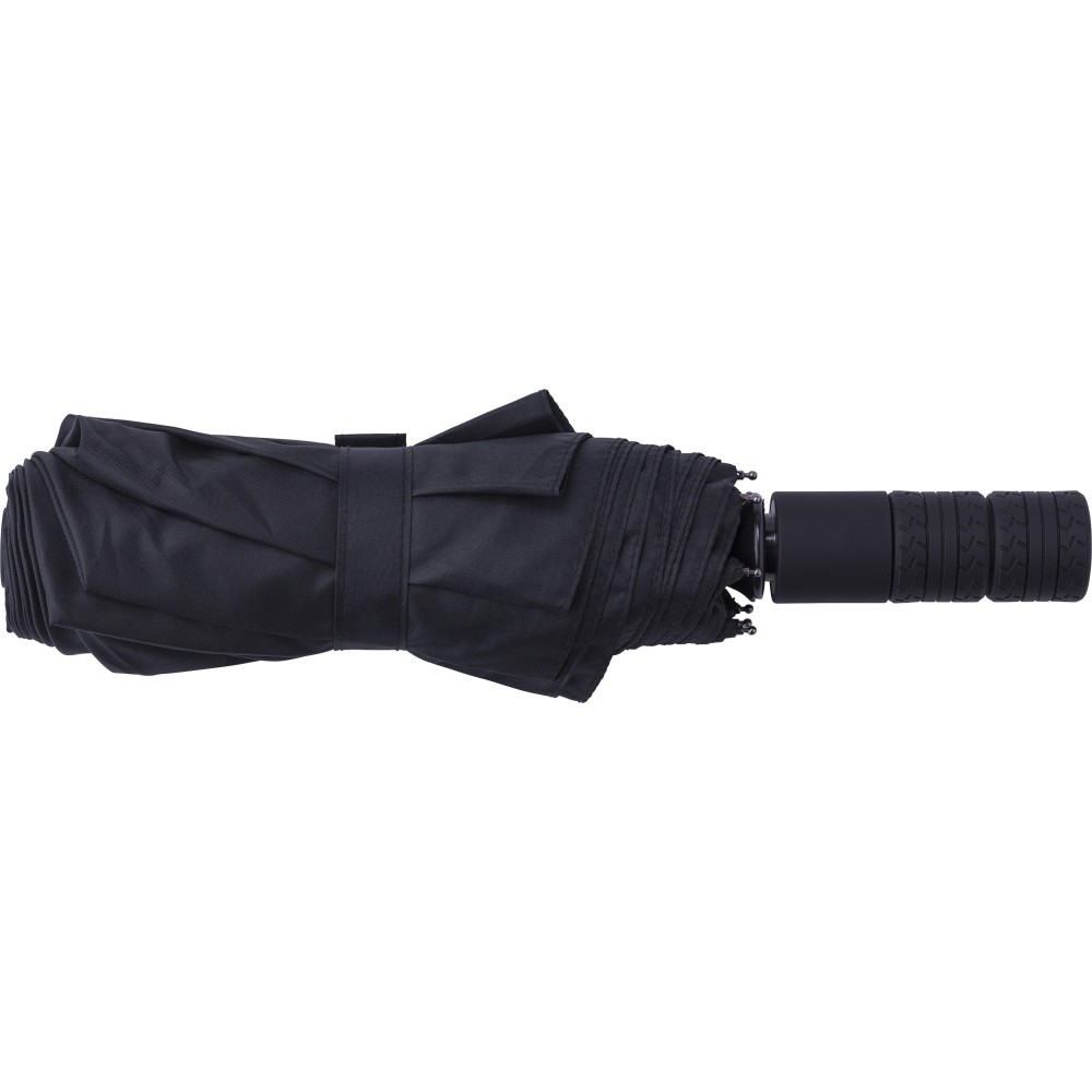 Automata nyitású és zárású, összecsukható esernyő 8 panellel, tokkal. Nyele gumis mintázatú, az autók abroncsára emlékeztet. Vászna RPET pongee anyag. Mérete: 21". Emblémázás: Szitanyomás