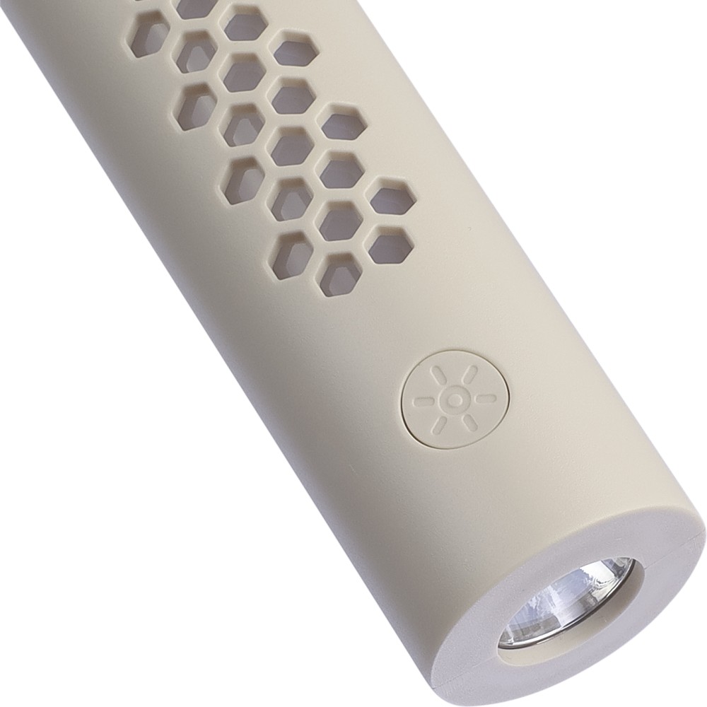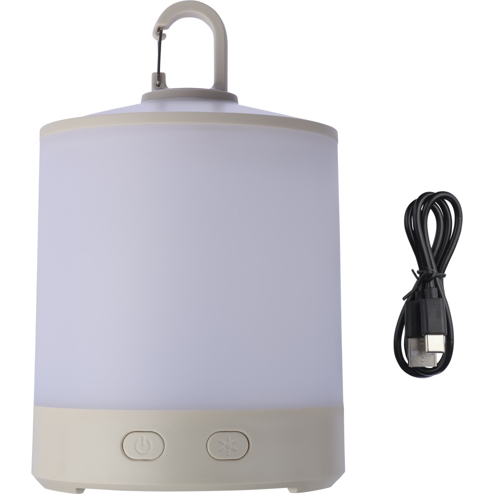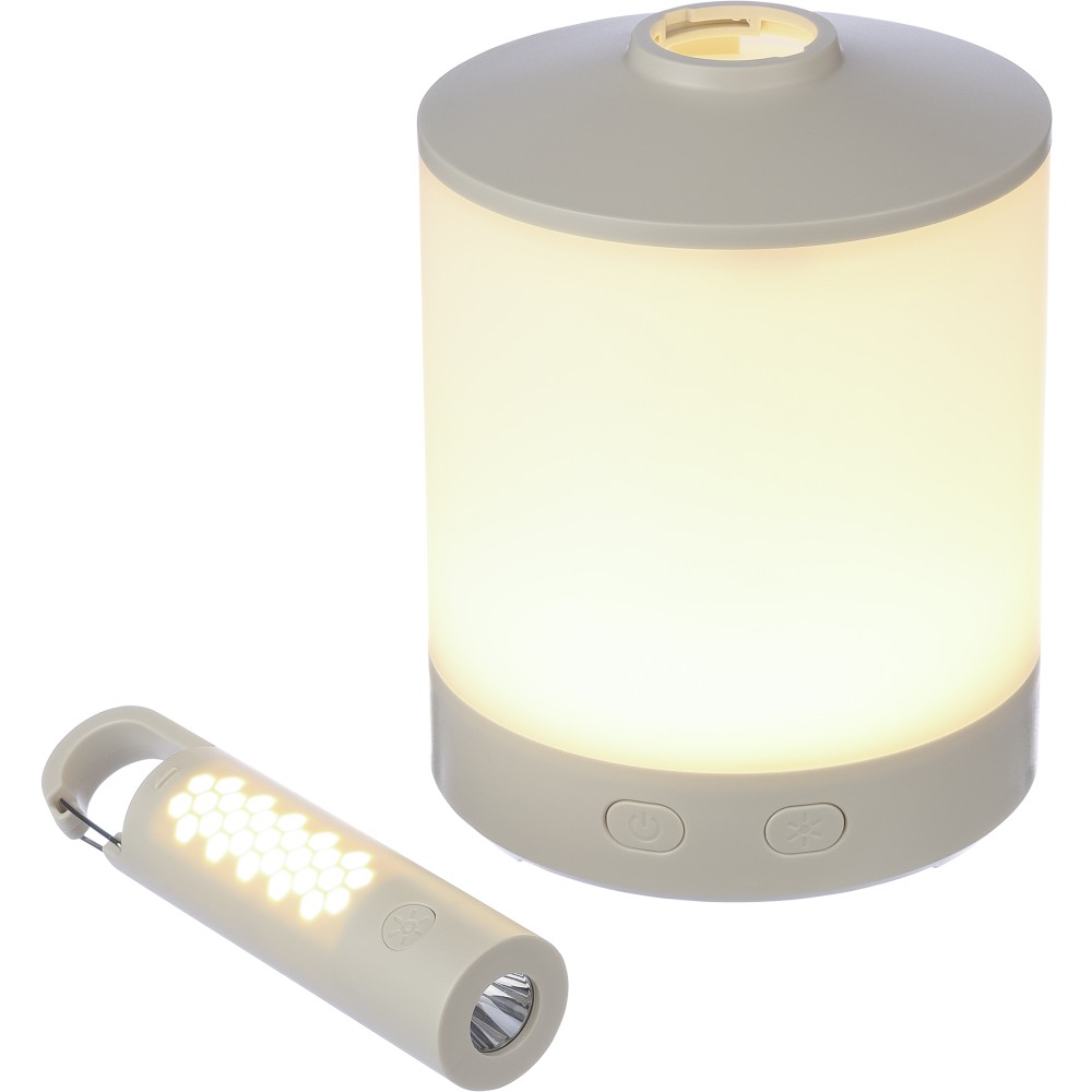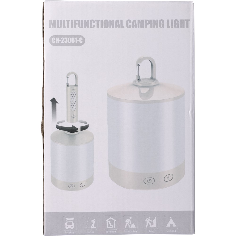 Multifunkciós lámpa kempingezéshez. Levehető elemlámpával, karabinerrel, 4 világítási móddal. 8-féle színben világít, melyek közül a fehér kétféleképpen is működtethető. A másik 7 szín váltakozóra is beállítható a gomb nyomvatartásával. Az elemlámpa 800 mAh-s, a kempinglámpa 2400 mAh-s akkumulátorral rendelkezik. C-típusú csatlakozók. Csomagolása papírdoboz. Emblémázás: Tamponnyomás