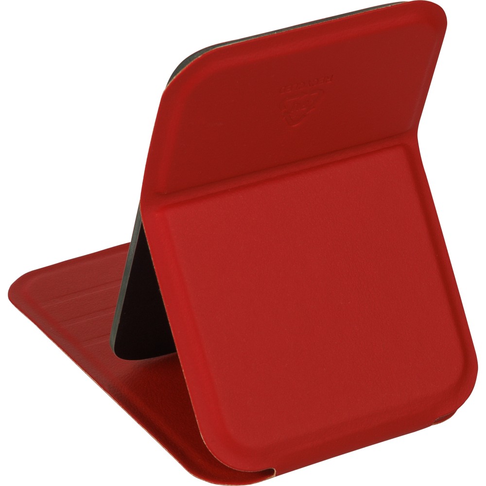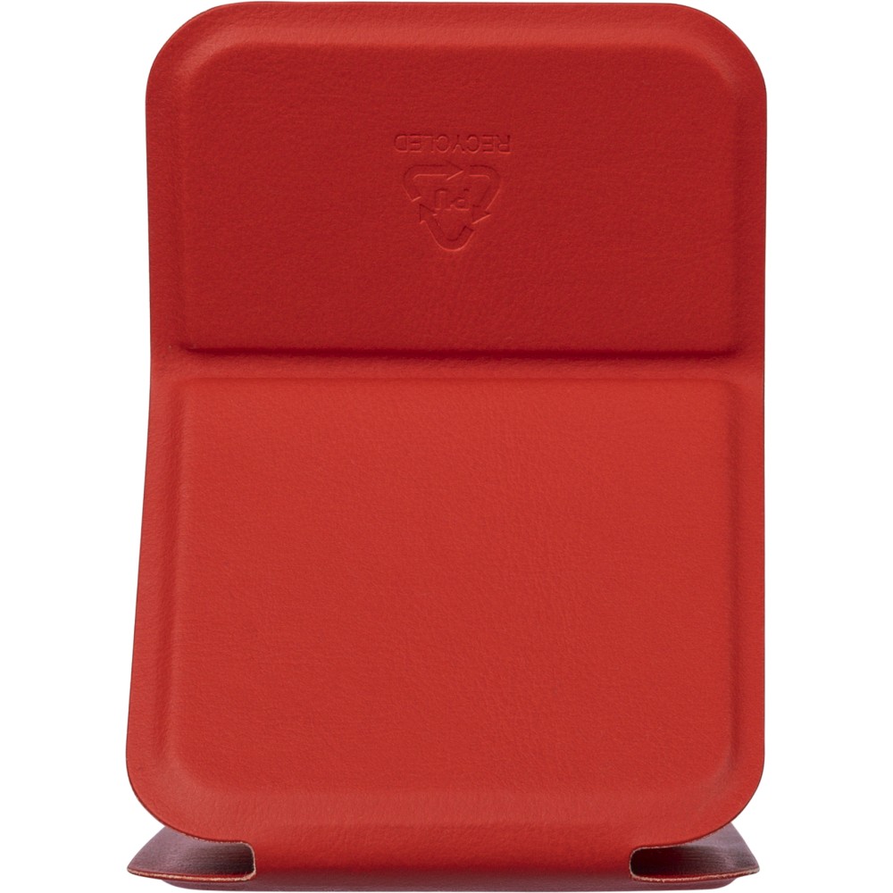 Üvegtükör összehajtható, újrahasznosított PU borítással, amely kinyitva álló helyzetben használható. A borításon dombornyomott, újrahasznosított alapanyagra utaló logó található. Papírtasakba csomagolva.