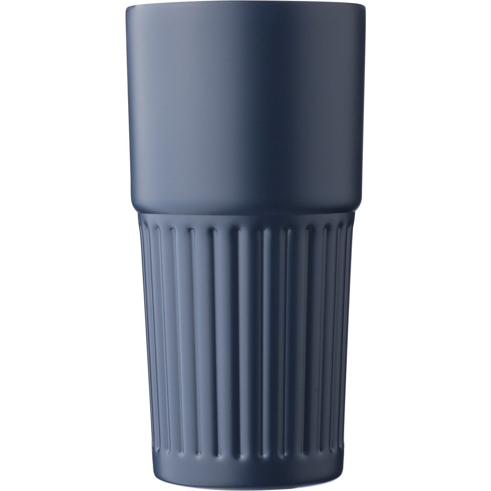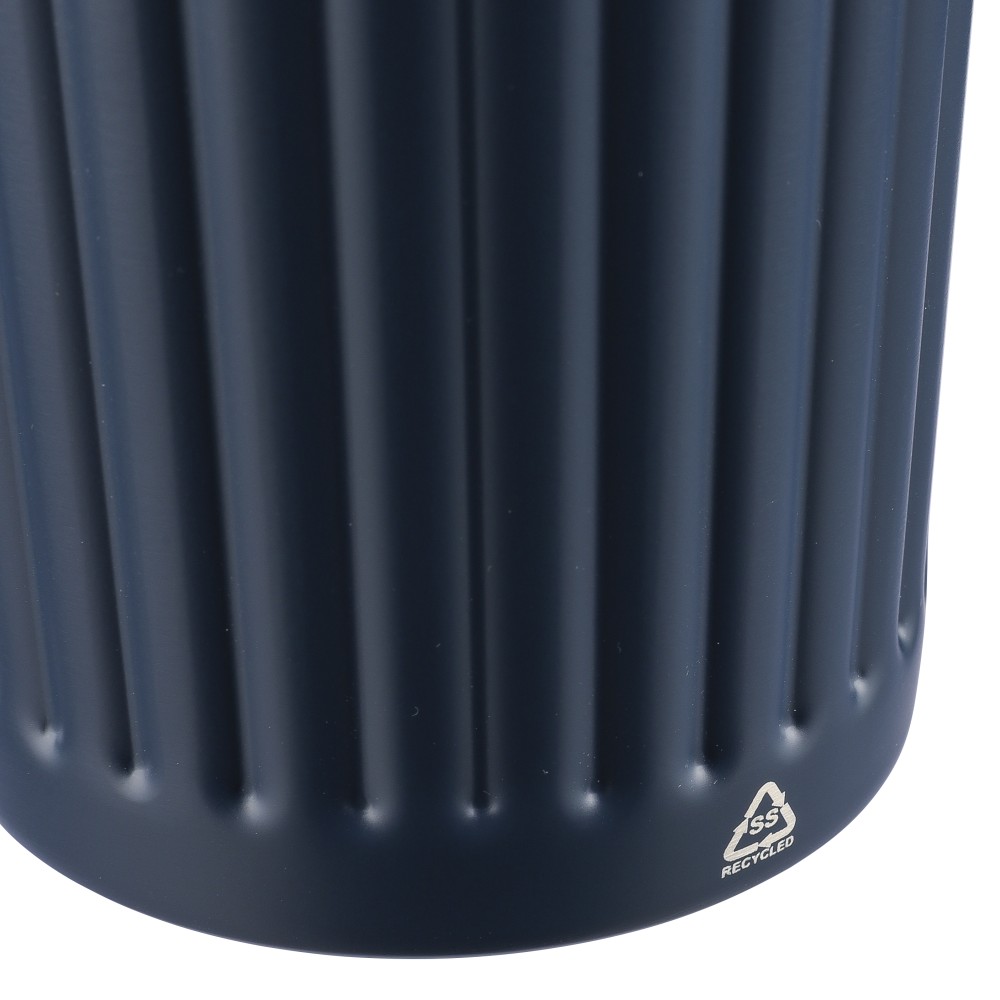 Újrahasznosított rozsdamentes acél útibögre, 450 ml. A belső 304-es, a külső 201-es rozsdamentes acélból készült, bordás markolattal, műanyag, csúszózáras fedéllel. Gravírozott újrahasznosított logó található a bögrén. Csomagolása barna papírdoboz. Emblémázás: Körszita
