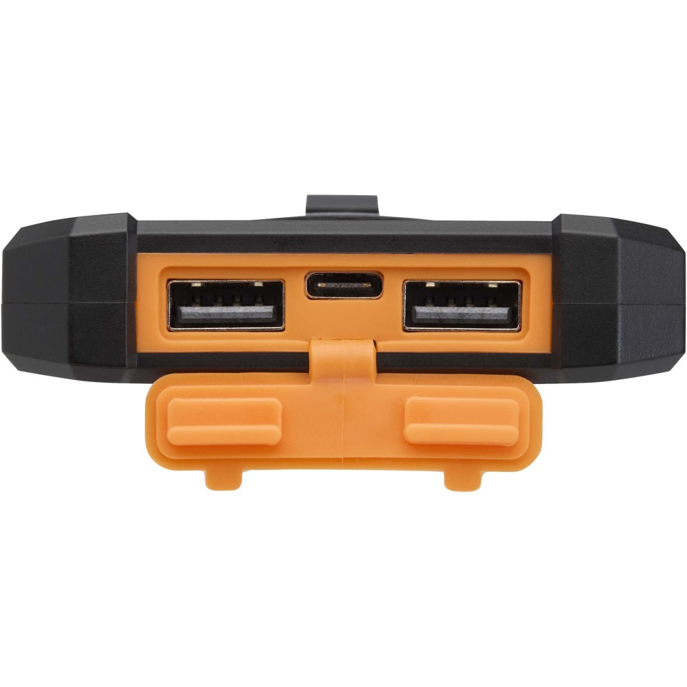 Az Altair 5000 mAh-s napelemes powerbank újrahasznosított műanyagból készül, tartósságra és kényelmes használatra tervezve. Két USB-A kimeneti porttal és egy Type-C bemenet/kimenettel rendelkezik, így rugalmas töltési lehetőségeket kínál. Masszív külső borítása és levehető csíptetője megkönnyíti a rögzítést, beépített zseblámpája pedig praktikus kiegészítő. A csatlakozók szilikon fedél mögött biztonságosan elhelyezve találhatók, a napelemes töltés funkció és az állapotjelző LED pedig ideálissá teszi szabadtéri kalandokhoz és utazásokhoz. Emblémázás: Tamponnyomás