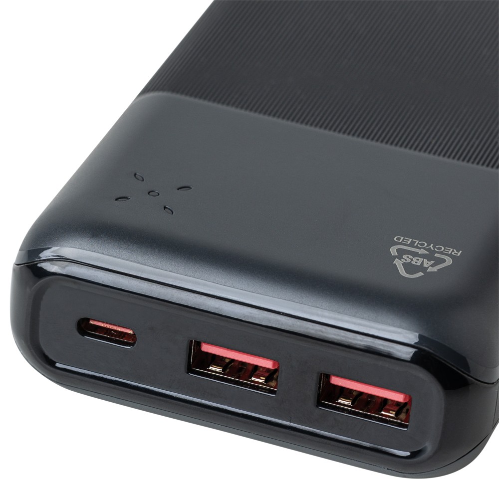 Újrahasznosított ABS anyagból készült powerbank 20 000 mAh kapacitással és 22,5 W gyors töltési teljesítménnyel. Type-C in/out és Type-A bemenettel, LED visszajelzővel és biztonsági védelmekkel. A hátoldalon gravírozott recycled (újrahasznosított) alapanyagra utaló logó található. Selyempapírral bélelt barna dobozba csomagolva.