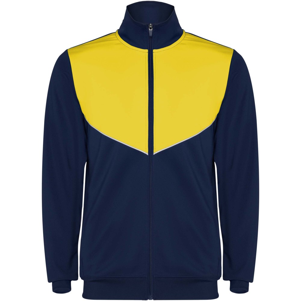 Könnyű és rugalmas anyagból készült melegítő. A végig cipzáros felső kontrasztos színű és varrású díszítésekkel dekorált a mellrészen. Oldalzsebek. Bordázott ujj- és és derékpasszé. Nadrág gumis derékkal és húzózsinórral, kontrasztos oldalsó varrással. Cipzáras szegély. Emblémázás: Hímzés, Szitanyomás