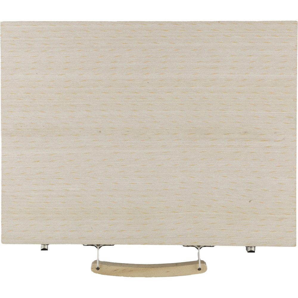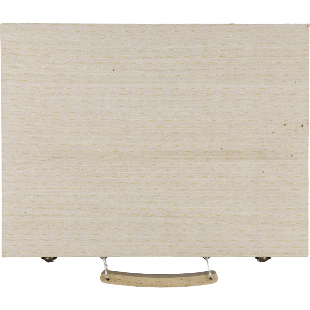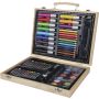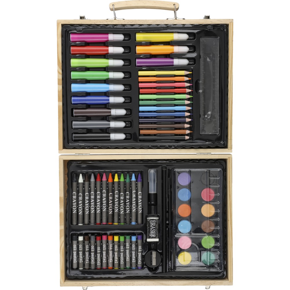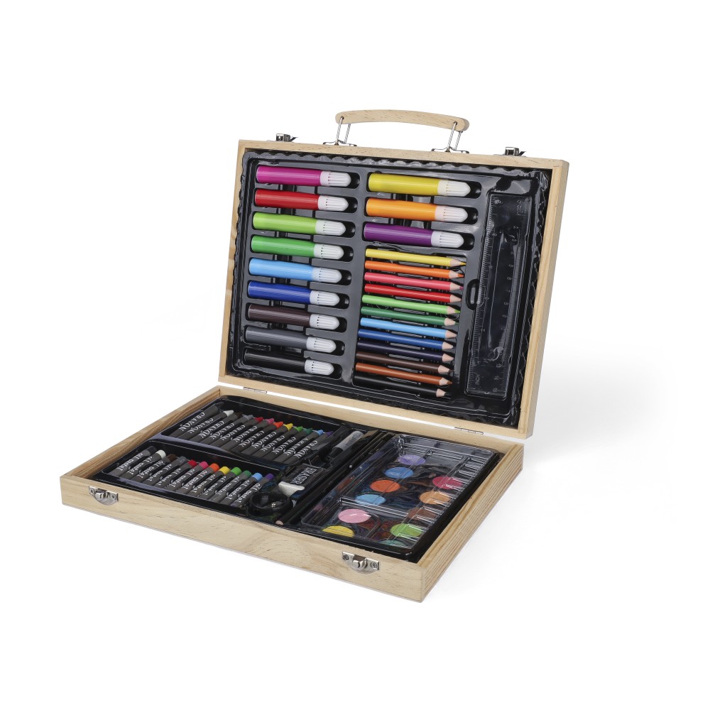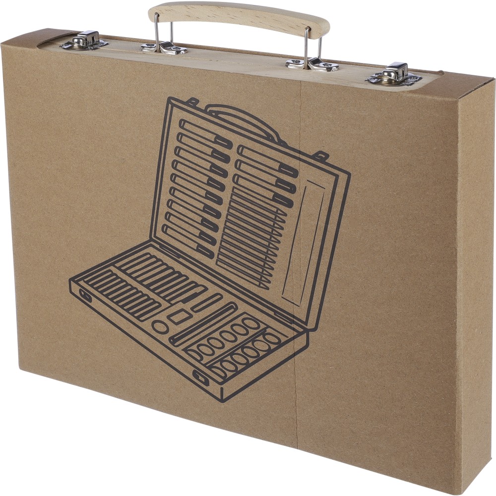 66 db-os rajzkészlet fa tartóban, fa fogantyúval. Tartalma: 12 db zsírkréta, 12 db színes filctoll, 12 db kihegyezett színes ceruza, 12 db olajpasztell kréta, 12 db festék, ragasztóstift, radír, ceruzahegyező, vonalzó, ecset és festőpaletta. Csomagolása barna papírdoboz. Emblémázás: Gravírozás, Tamponnyomás