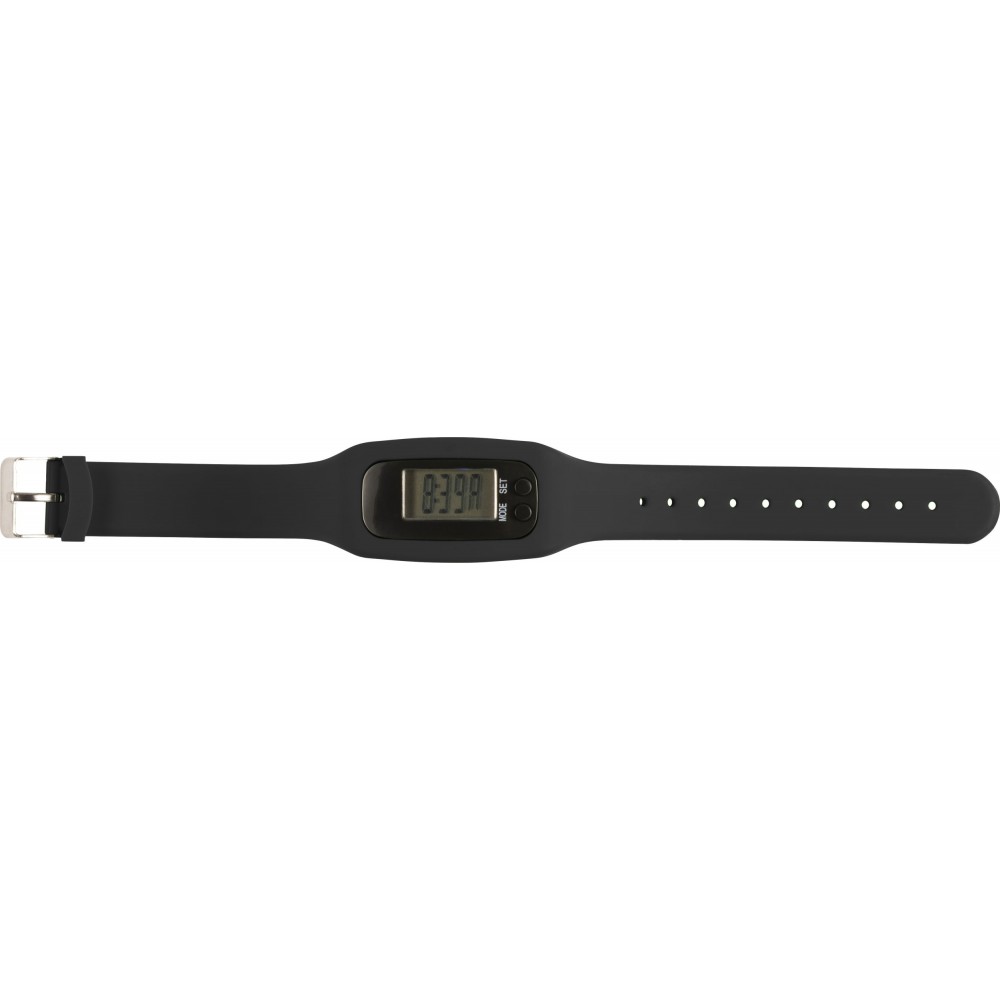 Lépésszámláló szilikon csuklópánttal. A lépéseket 99 999-ig számolja, kalória és mérföld/kilométer számlálóval és óra funkcióval rendelkezik. Az elemet tartalmazza. DC: 1.5V, ABS, szilikon Emblémázás: Tamponnyomás