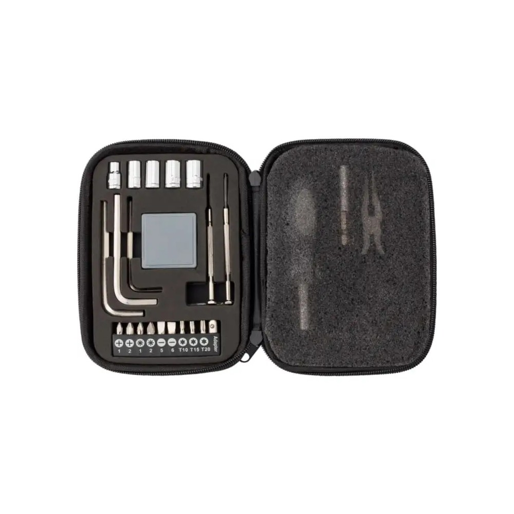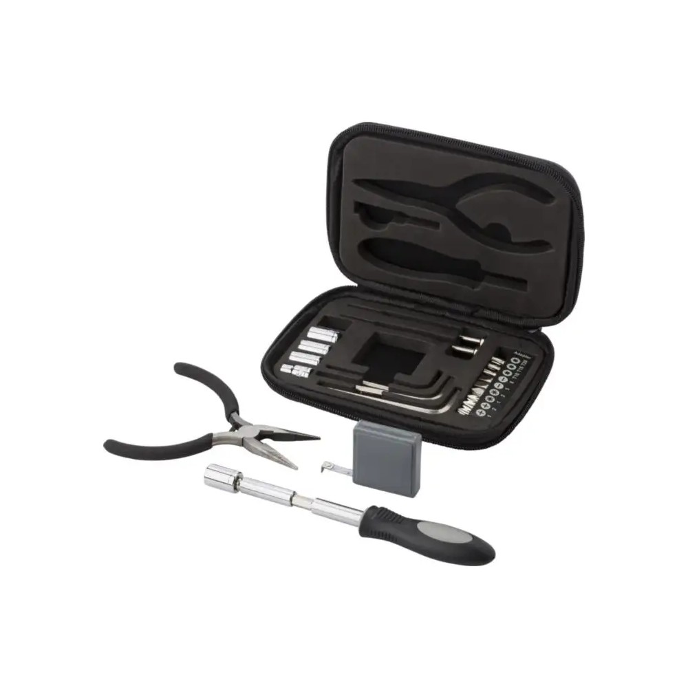 Szerszámkészlet cipzáros préseltbőr tokban. Tartalma sok hasznos eszköz és mérőszalag. Emblémázás: Tamponnyomás