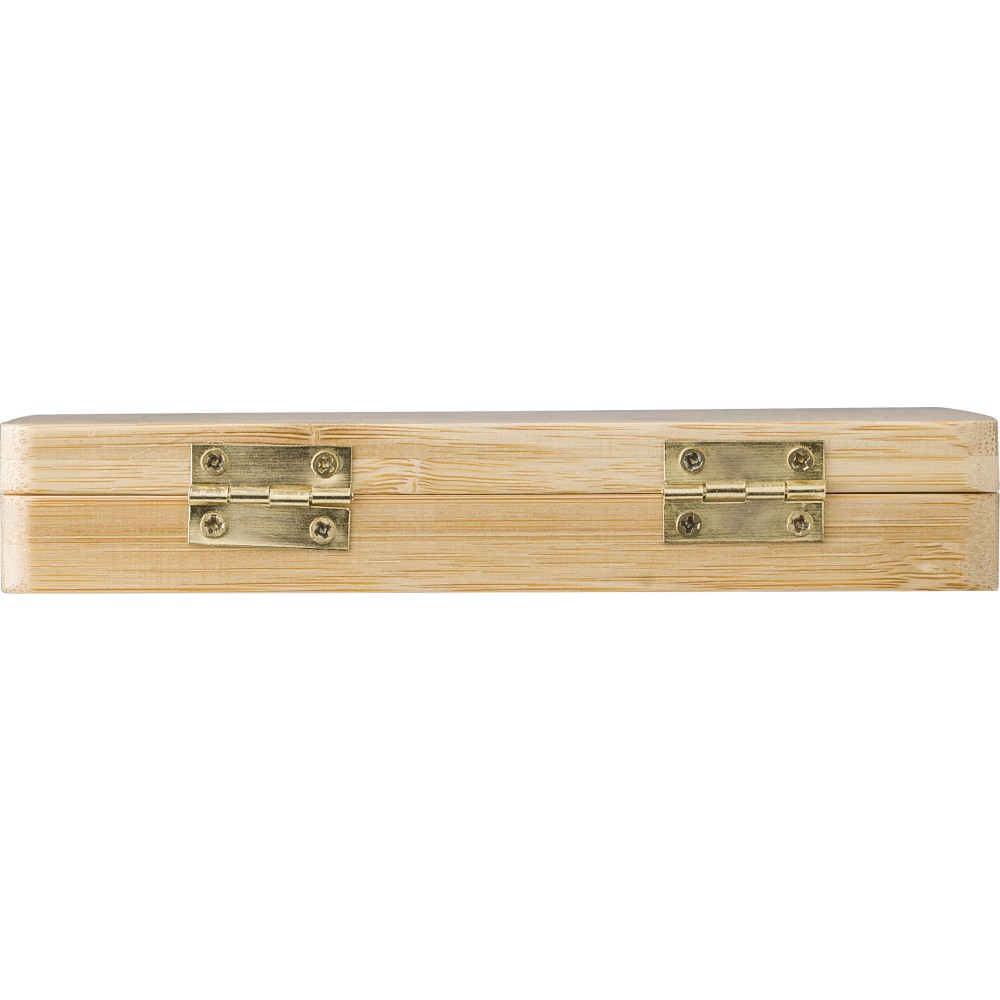 25 darabos szerszámkészlet bambuszdobozban. 24 db hegy és egy fogó. Csomagolása barna papírdoboz. Emblémázás: Gravírozás, Tamponnyomás