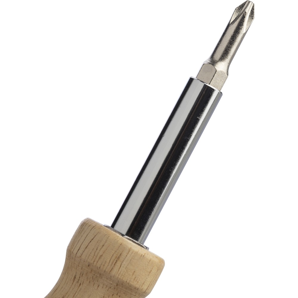 Kaucsukfa csavarhúzókészlet a nyélben tartható 4 db mágneses fejjel (2-2 db mindegyik kétoldalas hegyen). Praktikus és kompakt kialakítás cserélhető fejekkel és tartóval. Csomagolása barna papírdoboz. Emblémázás: Gravírozás