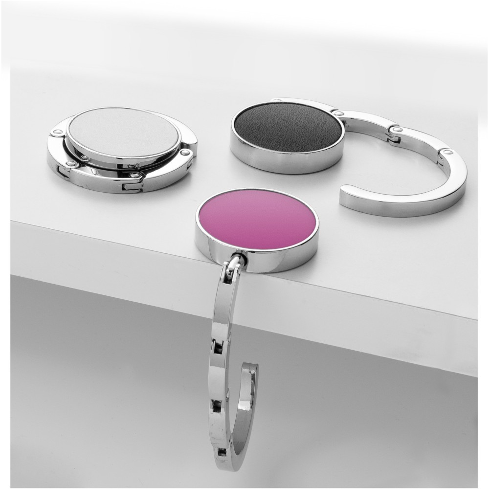 Összehajtható táskaakasztó, mellyel tisztán és biztonságban tarthatja táskáját. Az akasztót bármely felszín peremére felrögzítheti, max. 4,5 kg súlyt bír el. Fekete ajándékdobozban. Emblémázás: Tamponnyomás, UV nyomtatás