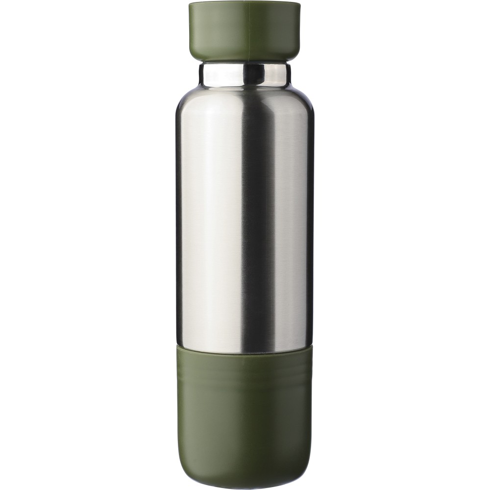 Duplafalú rozsdamentes acél kulacs, 500 ml-es. 304-es rozsdamentes acél belsővel és 201-es rozsdamentes acél külsővel. Átlátszó rekesszel ellátott PP csavaros kupakkal, cserélhető poliészter csuklópánttal, valamint egy 200 ml-es PP pohárral az alján. Ezüst színű felület matt részletekkel. Csomagolása barna papírdoboz. Emblémázás: Gravírozás