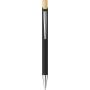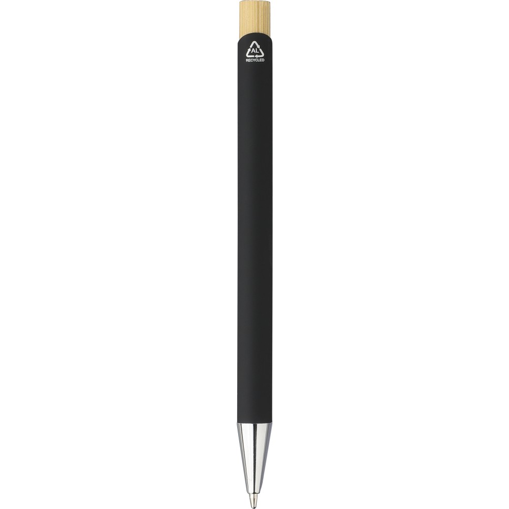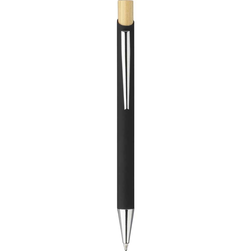 Bambusz írószerkészlet, amely egy bambuszból és gumírozott, újrahasznosított alumíniumból készült golyóstollat tartalmaz kék tintával, bambusz nyomógombbal és krómozott műanyag heggyel. Bambuszból és gumírozott rozsdamentes acélból készült téglalap alakú kulcstartóval. Mindkét termék felülete lézergravírozás után tükörhatású lesz, és újrahasznosított alumínium logóval van ellátva. Bársonyberakásos, kraftpapír dobozban csomagolva. Emblémázás: Gravírozás