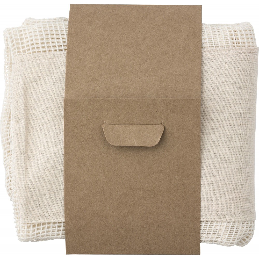 Többször használható, 3 darabos, hálós pamuttáska szett, stílusban illeszkedő kraftpapír csomagolásban. A táskák húzózsinórral zárhatóak és a sima pamut felület teret hagy az emblémázásnak. Emblémázás: Szitanyomás, Tamponnyomás