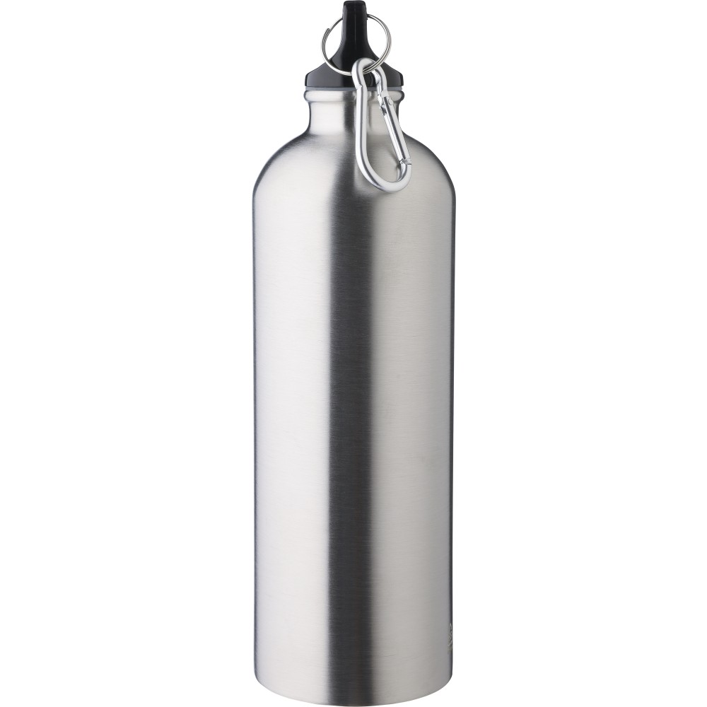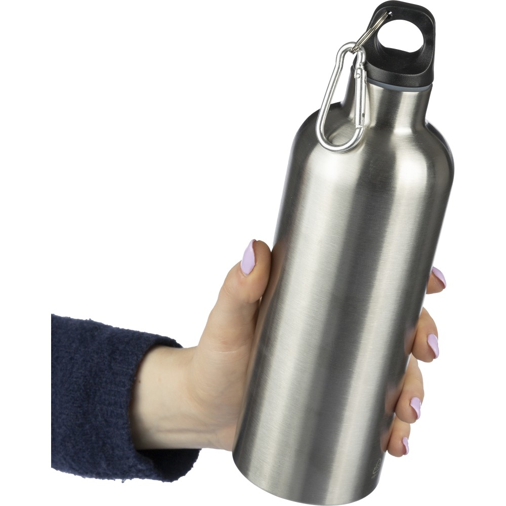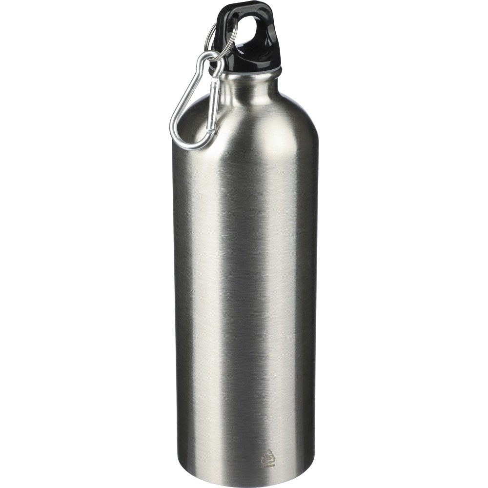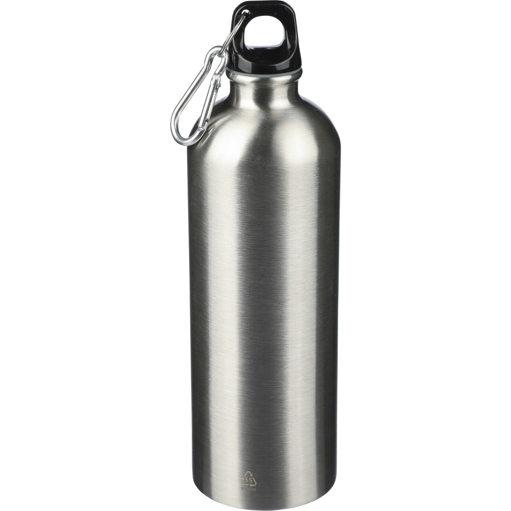 Újrahasznosított rozsdamentes acélból készült 750 ml-es szimplafalú kulacs PP kupakkal és alumínium karabinerrel. Az újrahasznosított anyagra utaló logó a palackra van gravírozva. Mosogatógépben nem tisztítható. Emblémázás: Bögredekor, Gravírozás, Körszita